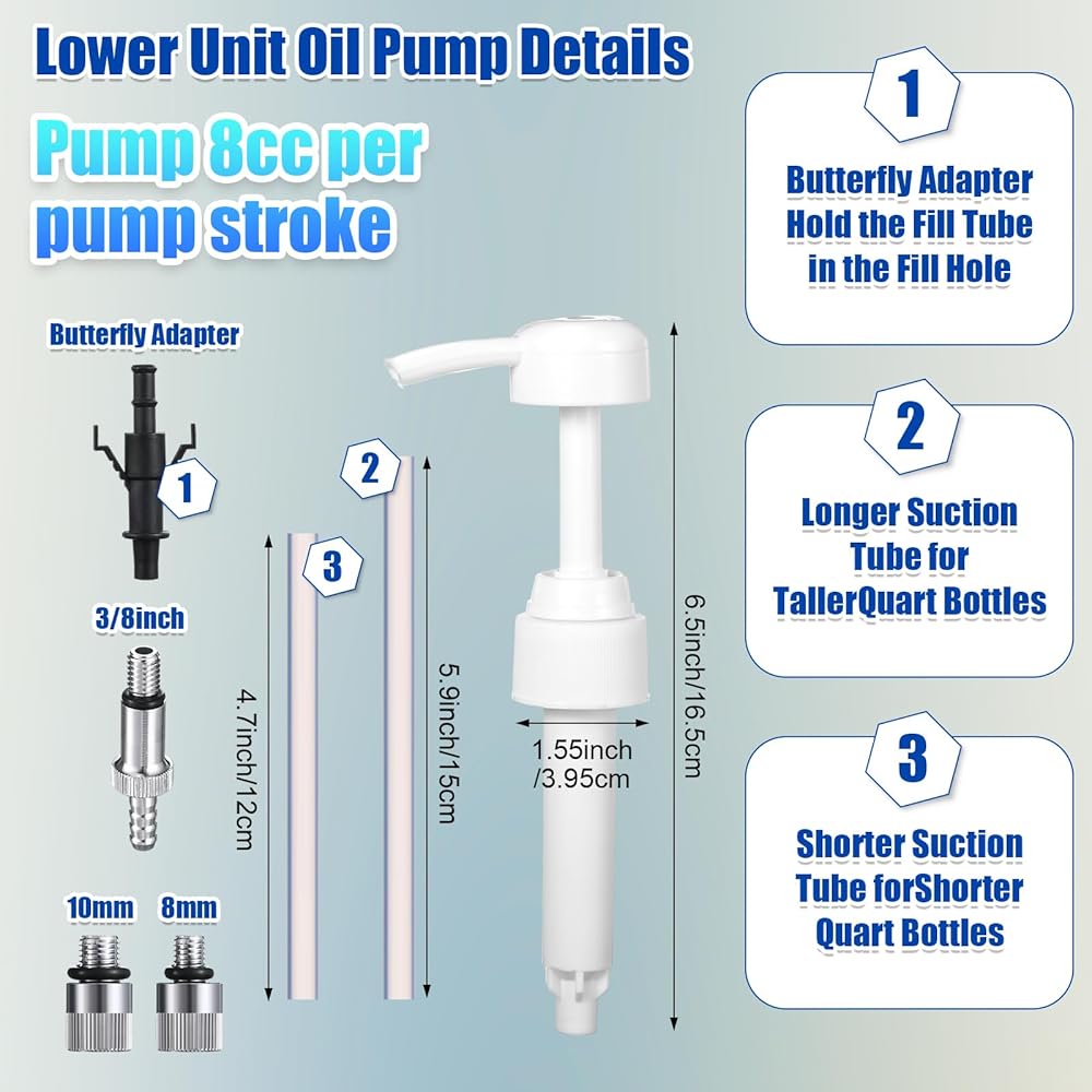 Gear Fluid Pump: lower unit oil pump comes with 2 rigid suction tubes, 1 third hand adapter, 1 metal 3/8 inch swivel adapter, 1 metal 8mm adapter, 1 metal 10mm adapter, different dimensions can meet your different use needs; It pumps 8cc per pump stroke, and can easily and conveniently switch between different liquids for fast and efficient fluid transfer