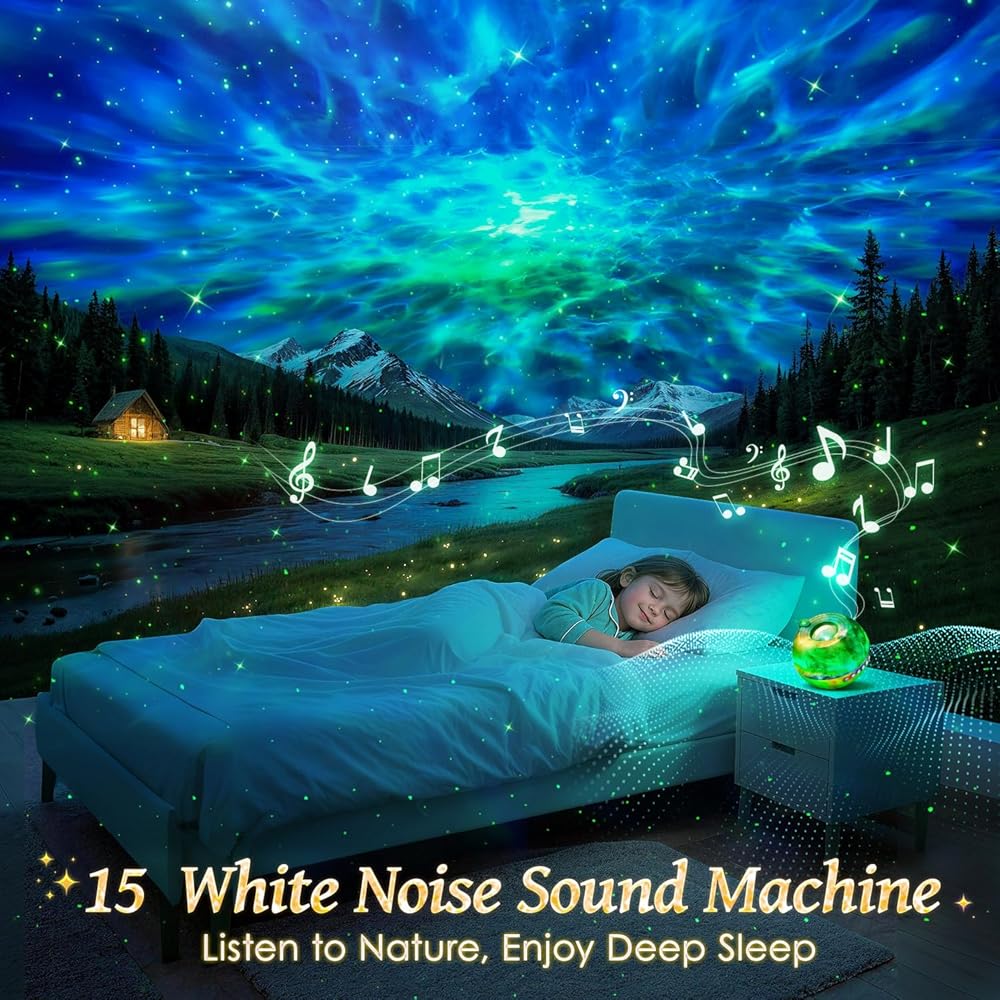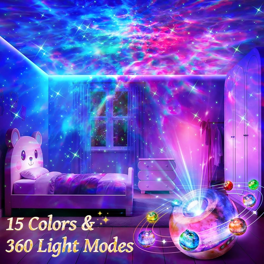 جهاز عرض جالاكسي لغرفة النوم، جهاز عرض نجمي جالاكسي 15 لونًا للأطفال، جهاز عرض ضوء ليلي للأطفال، جهاز تحكم عن بعد 15 ضوضاء بيضاء أضواء نجمة السقف هدية لغرفة النوم