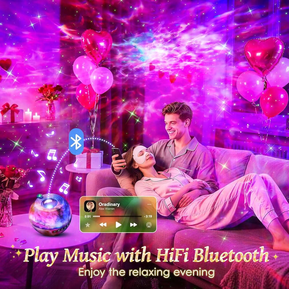 【جهاز عرض جالاكسي لغرفة النوم مع مكبر صوت بلوتوث HIFI 5.2】 يتميز جهاز عرض جالاكسي لغرفة النوم وجهاز عرض النجوم جالاكسي لايت لغرفة النوم بمكبر صوت بلوتوث 5.2 عالي الجودة للاستماع إلى الموسيقى المفضلة لديك، مما يسمح لك بالاسترخاء من الموسيقى وأضواء المجرة المهدئة وضوء النجوم. جهاز العرض النجمي Galaxy Light Projector لغرفة النوم مناسب أيضًا بشكل خاص للرقص والحفلات. ومن خلال التحكم الصوتي، يقفز ضوء المجرة على إيقاع الموسيقى وأضواء النجوم لجهاز عرض السقف تصل الحفلة إلى ذروتها. لن تخيب جودة الصوت المذهلة لجهاز عرض النجوم جالاكسي لايت لغرفة النوم، مما يوفر تجربة استماع لا مثيل لها.