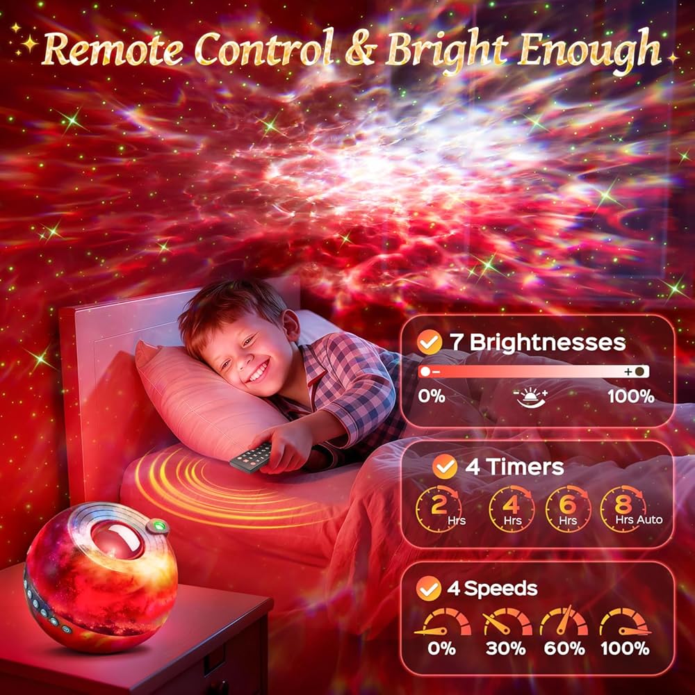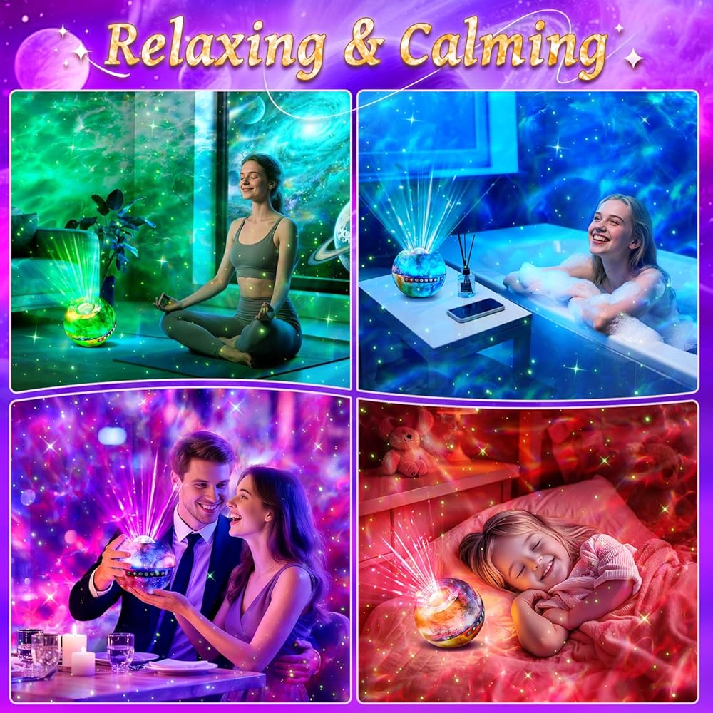 【جهاز عرض جالاكسي لغرفة النوم مع 15 ضوضاء بيضاء】جهاز عرض جالاكسي لغرفة النوم وجهاز عرض النجوم جهاز عرض ضوء جالاكسي لغرفة النوم مع 15 ضوضاء بيضاء يأخذك إلى أصوات الطبيعة التي يمكن أن تساعدك وأطفالك على النوم بسهولة أكبر. الأصوات مريحة ومهدئة أثناء محاولتك النوم أو التأمل. سواء كنت طفلاً أو شخصًا بالغًا، يمكنك الاستمتاع بكل ليلة هادئة مع جهاز عرض النجوم جالاكسي لايت لغرفة النوم. استخدم جهاز العرض النجمي Galaxy Light Projector لغرفة النوم وأضواء النجوم لجهاز عرض السقف كآلة ضوضاء بيضاء وكأداة مهدئة، تساعدك هذه الضوضاء البيضاء على الاسترخاء ومحاربة الأرق. مزيج الضوضاء البيضاء وضوء المجرة مذهل!