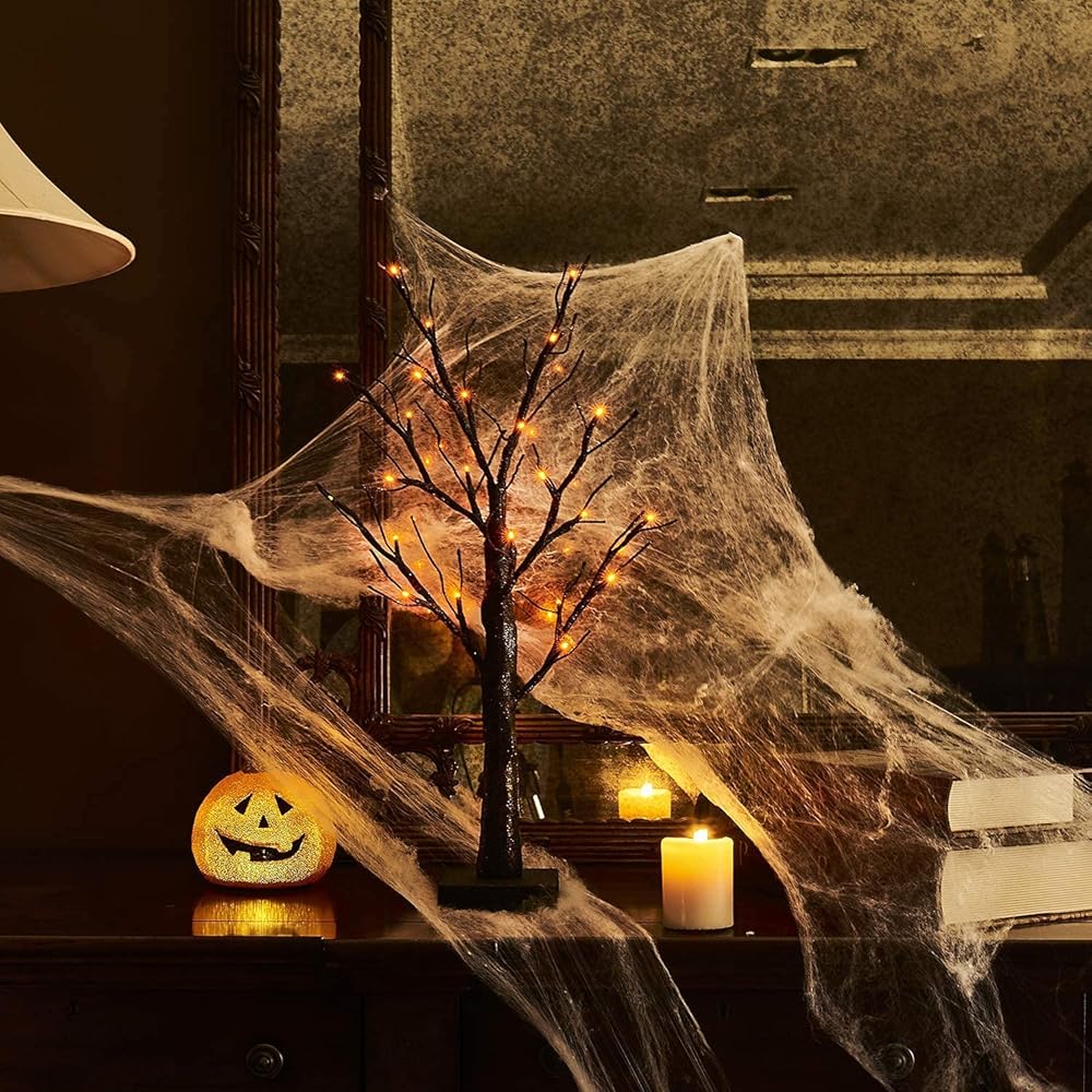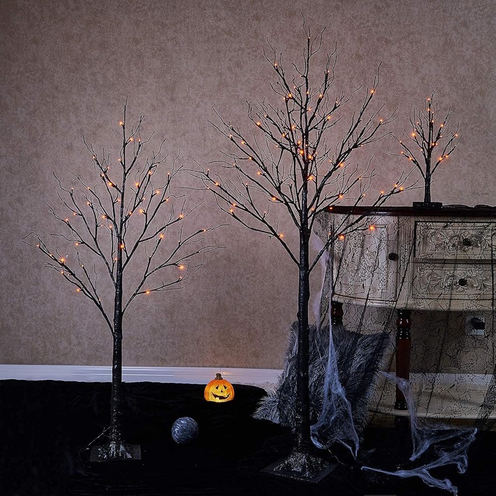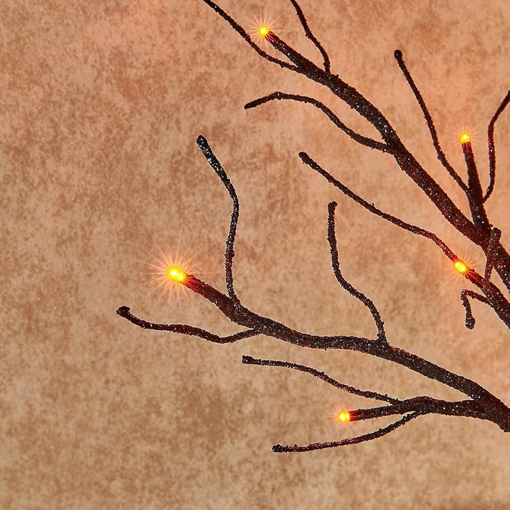 شجرة مخيفة سوداء لامعة على سطح الطاولة من Hairui مع أضواء برتقالية 24 LED 18 بوصة لتزيين ساحرة الهالوين تعمل بالبطارية أو قابس USB في الاستخدام الداخلي