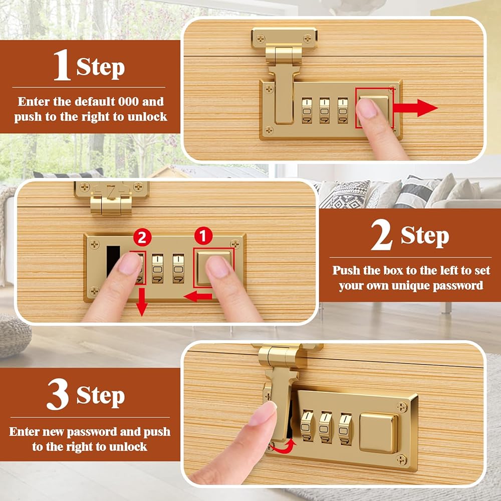إعداد كلمة مرور قفل كلمة المرور: تم ضبط القفل مسبقًا على 0-0-0 2) حرك المفتاح إلى اليسار، وقم بلف العجلة إلى الرقم المقابل، وقم بتعيين كلمة مرور شخصية حصرية. يعد إعداد رمز التخصيص الخاص بك أمرًا سهلاً. تم تصميم أقفالنا المركبة لإعداد كلمة مرور سهلة، مما يضمن إمكانية إنشاء كلمة مرور آمنة بسرعة دون أي إجراءات معقدة.