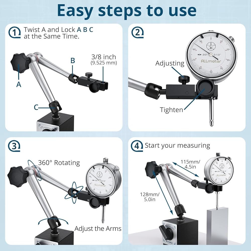 • تصميم متين: تم تصميمه لتلبية معايير ASME/ANSI، ويتميز مؤشر القرص الخاص بنا ببنية صلبة من الفولاذ المقاوم للصدأ لمتانة احترافية. ذراع الحامل القابل للتعديل، بأبعاد الذراع السفلي 5 بوصات، والذراع العلوي 4.5 بوصة، والارتفاع الإجمالي 14.1 بوصة، يوفر الثبات من خلال مفصله الدوار الدقيق. عمود الدوران العالمي مع مقبض الضبط الدقيق يعزز دقة القياس