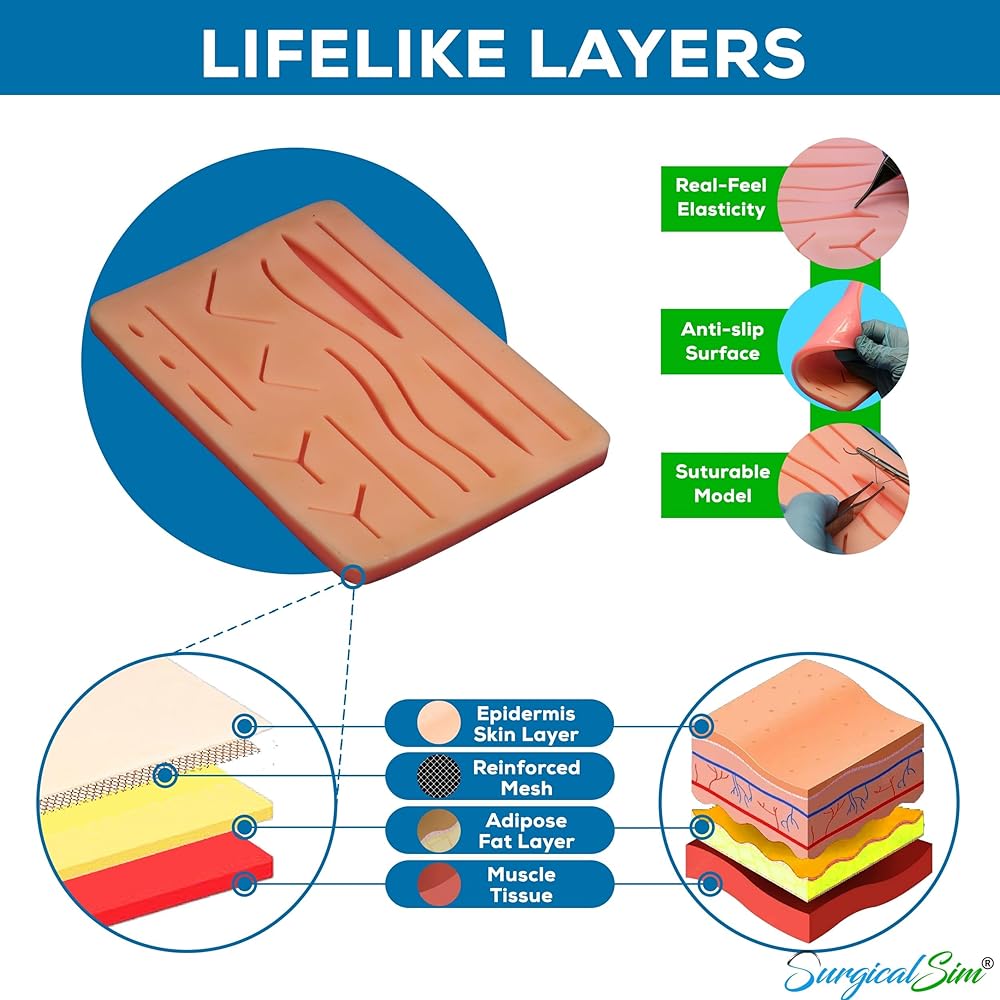 EXPERIENCE QUALITY - The durability of the silicone pad is what makes it so long-lasting. Three layers of simulated human tissue: skin, fat and muscle, provide real-feel layers for realistic simulation. Additionally, a built-in “mesh-layer” helps prevent the ‘pull-out' of threads whilst practicing, so that the silicone pad will remain intact even after many uses, saving you money in the long run.
