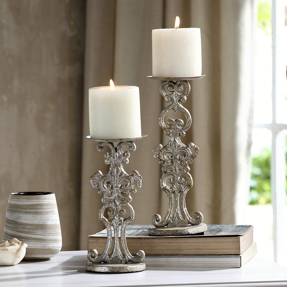 Pair of two pillar beautifully ornate candleholders, one 9.5" high and the other 7.5" high. Both made of cast iron with an antiqued silver over bronze finish. As the finish is applied by hand, subtle highlights of bronze and rose is not unusual. Fleur de lis feature. Holds pillar candles (not included.)