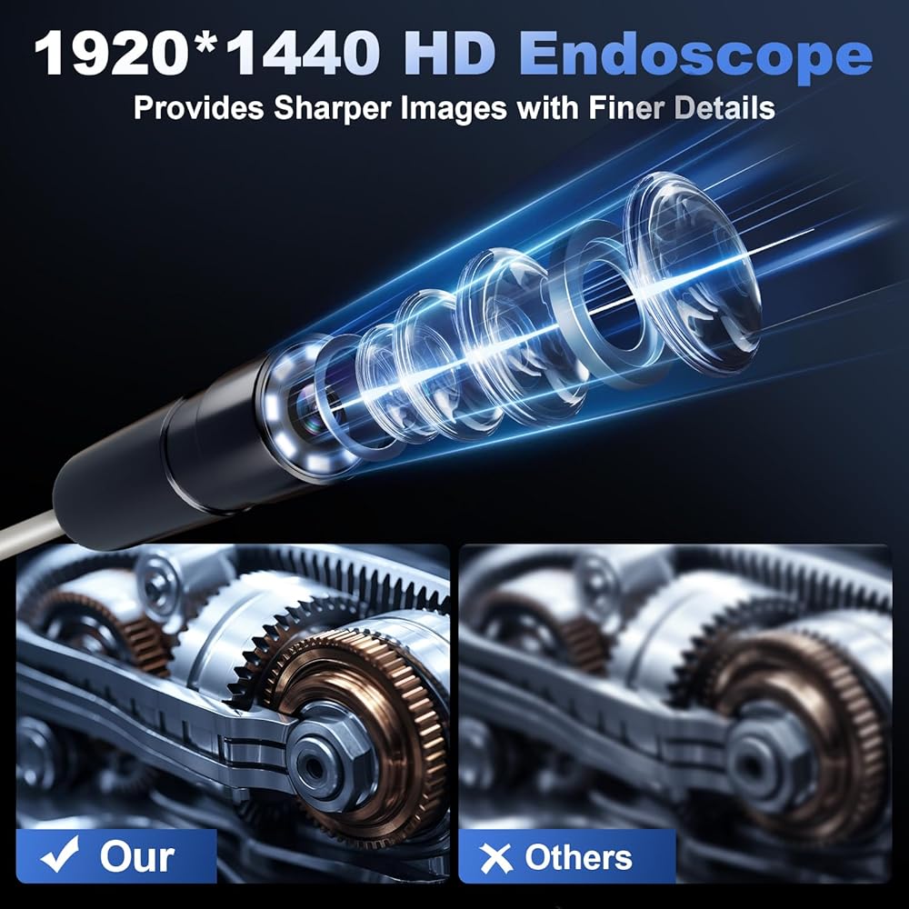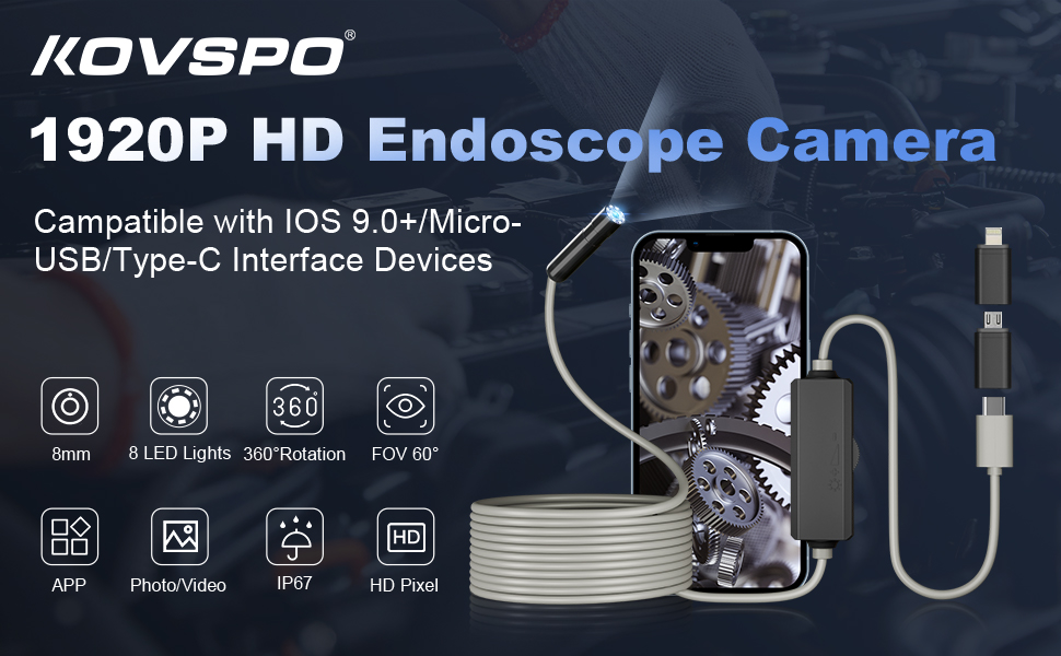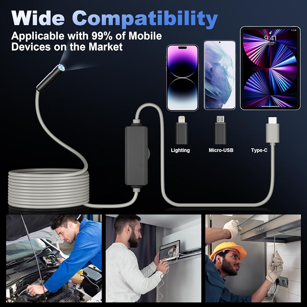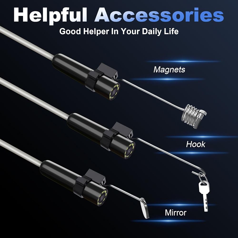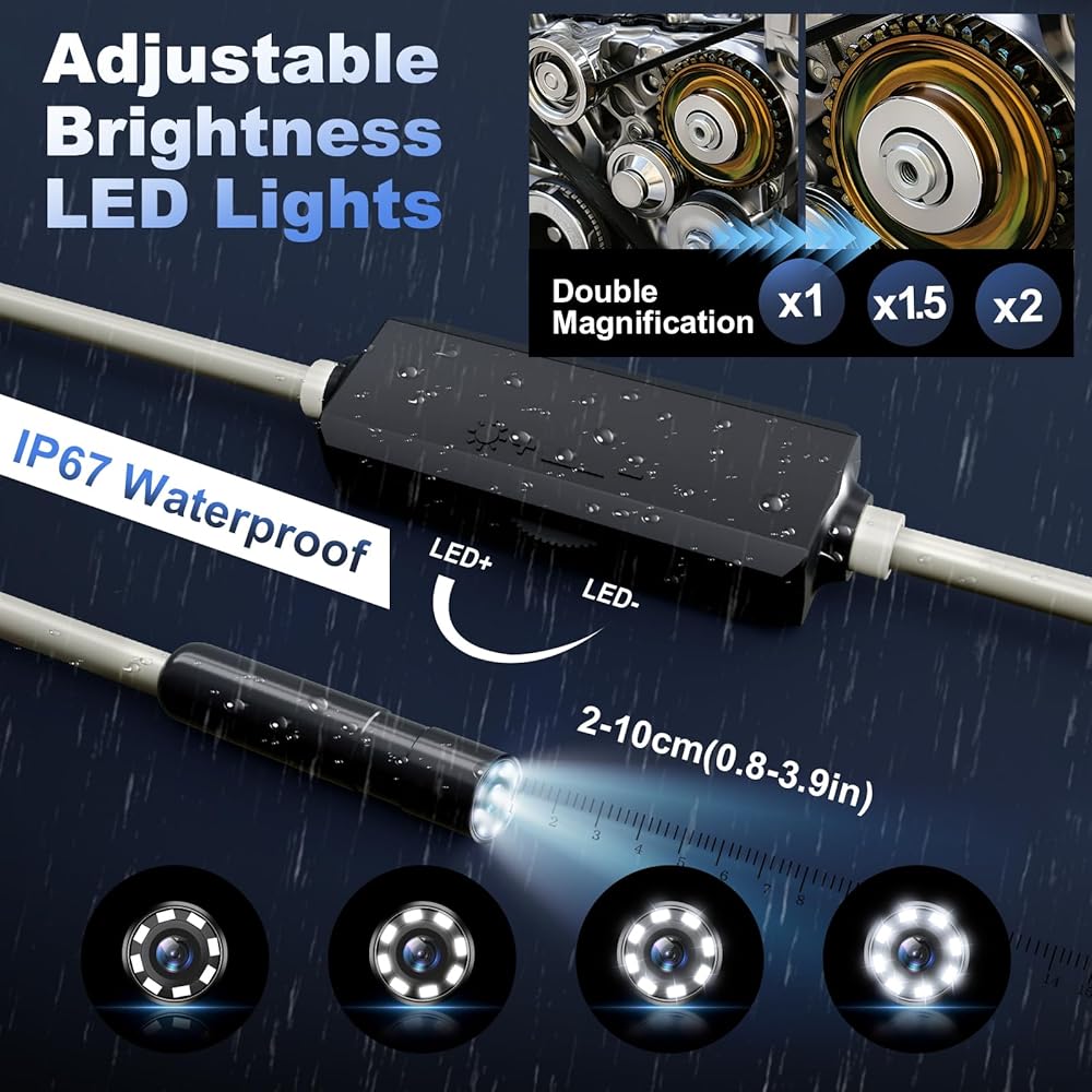 [إضاءة LED قابلة للتعديل] تمكنك كاميرا المنظار المدمجة بـ 6 مصابيح LED مع سطوع قابل للتعديل من الحصول على معلومات الصورة حتى في البيئات المظلمة. مستوى مقاومة الماء IP67 يجعل هذا المنظار مناسبًا لمشاهد مختلفة، مثل داخل السيارة أو حول المحرك أو داخل فحص الأنابيب أو الأسلاك.