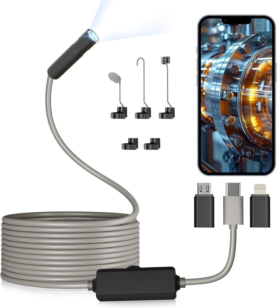 كاميرا المنظار مع الضوء، بوريسكوب مع 8 مصابيح LED قابلة للتعديل، المنظار مع كاميرا ثعبان شبه صلبة بطول 16.4 قدم، كاميرا فحص مقاومة للماء IP67 لنظامي iOS وأندرويد (رمادي)