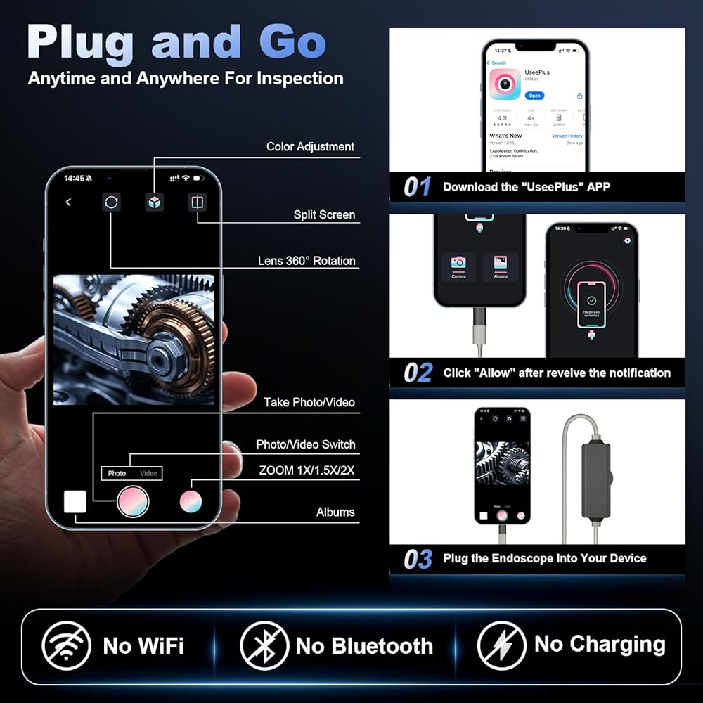 [توافق واسع] يمكن تجهيز هذا المنظار بثلاثة منافذ طراز (النوع C، Micro-USB، الإضاءة)، فقط قم بالتوصيل والتشغيل. لإكمال الرابط، ابحث عن "UseePlus" في متجر التطبيقات أو قم بتنزيل التطبيق عن طريق مسح رمز الاستجابة السريعة الموجود في التعليمات.