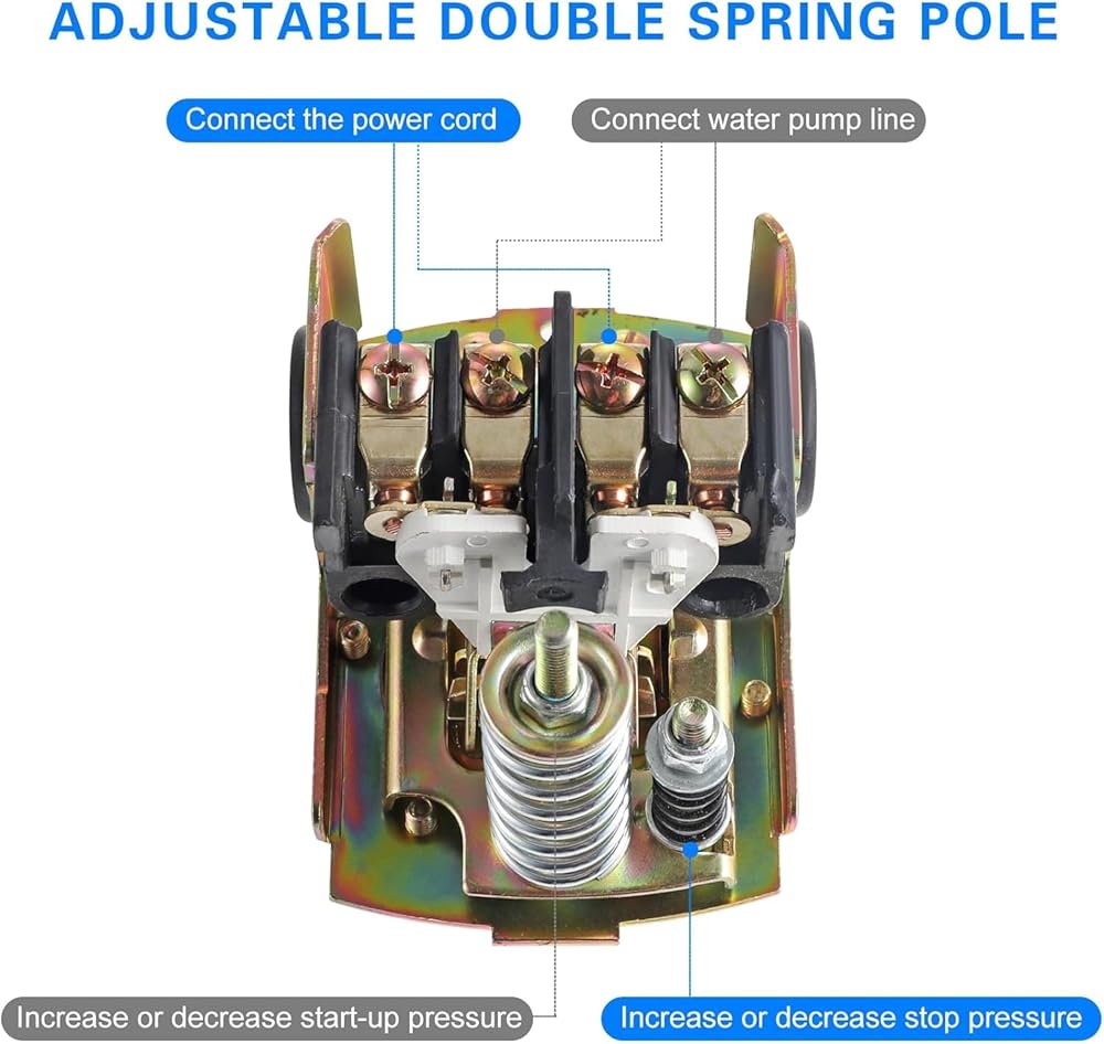 Adjustable pressure switch: This is a water pump pressure control switch for perfect pressure control. Pressure switch with 30-50 psi pressure setting range activates an electrically driven water pump within a power circuit when the adjustable rising and falling thresholds are reached.