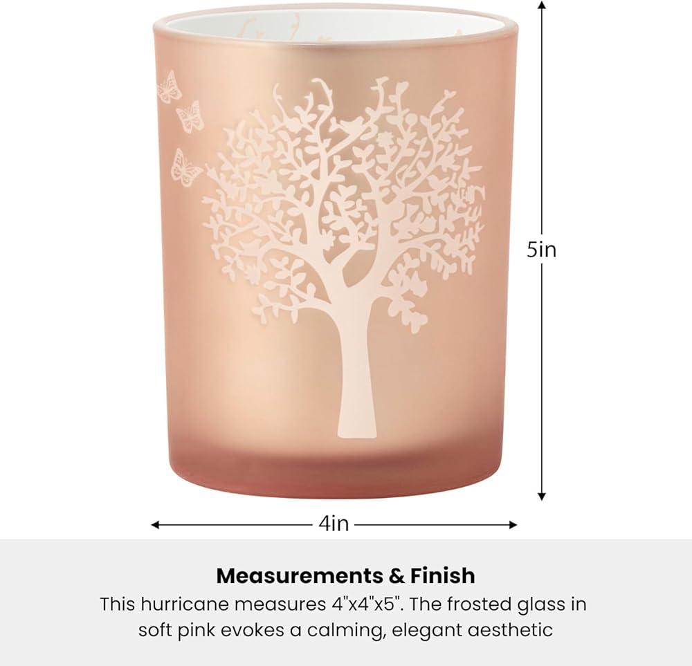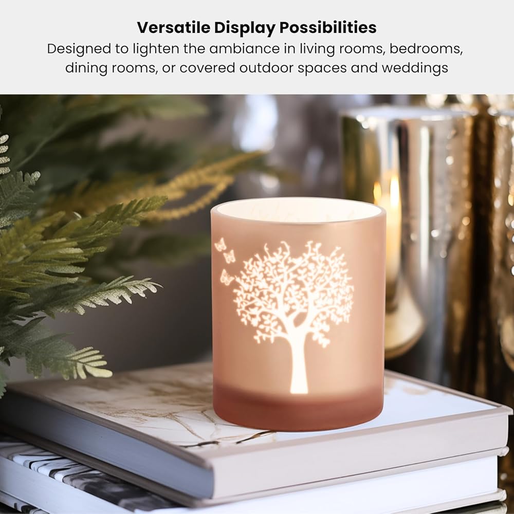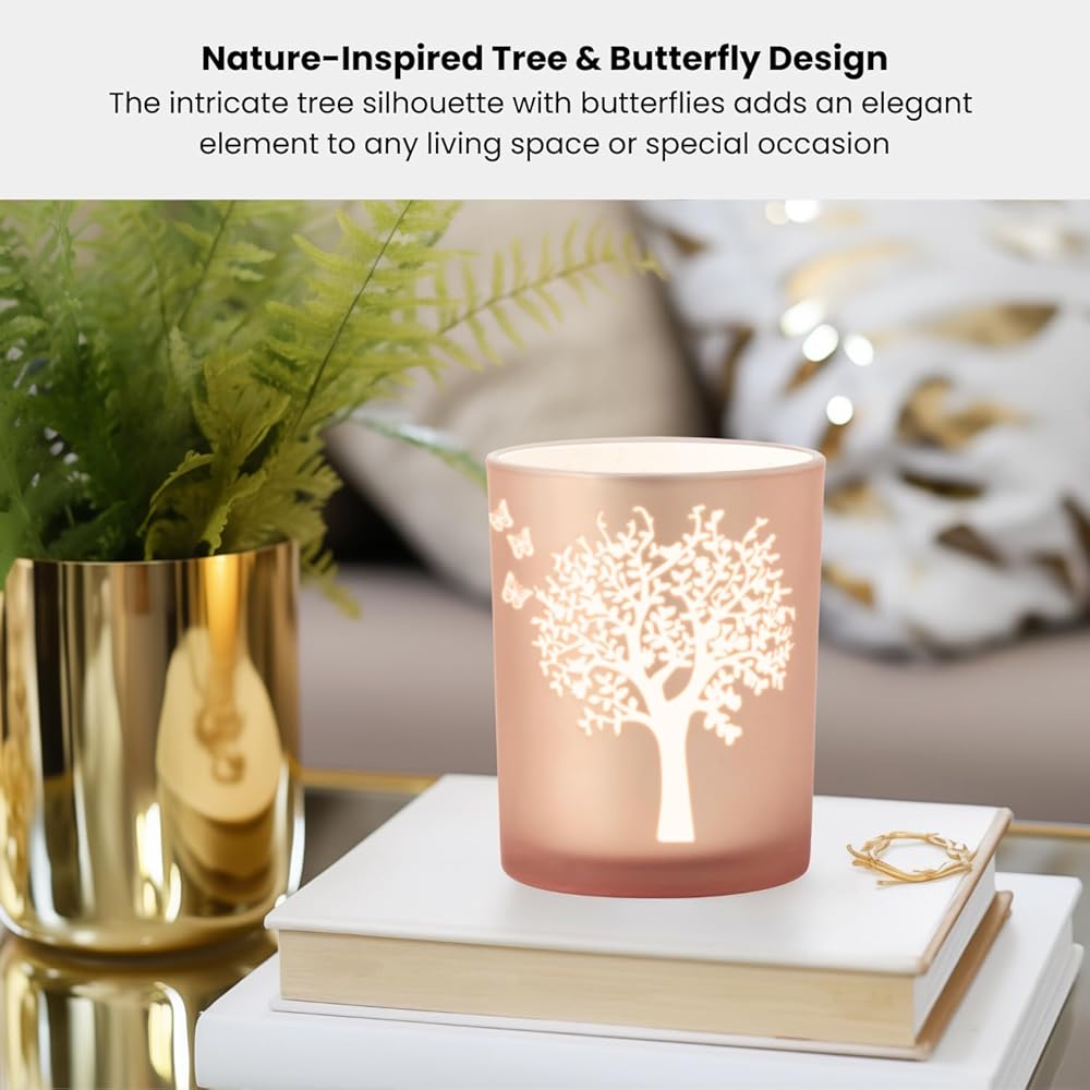 • ELEGANT BUTTERFLY DECOR: This 4x5" pink butterfly candle holder is crafted from high-quality glass in a chic cylinder shape with a frosted rose gold finish. Also available in 3x3" size, the captivating fluttering butterfly accents on these glass votive candle holders add a touch of whimsy and sophistication to any decor. They make perfect centerpiece table decorations for your dining table, coffee table, or mantle!