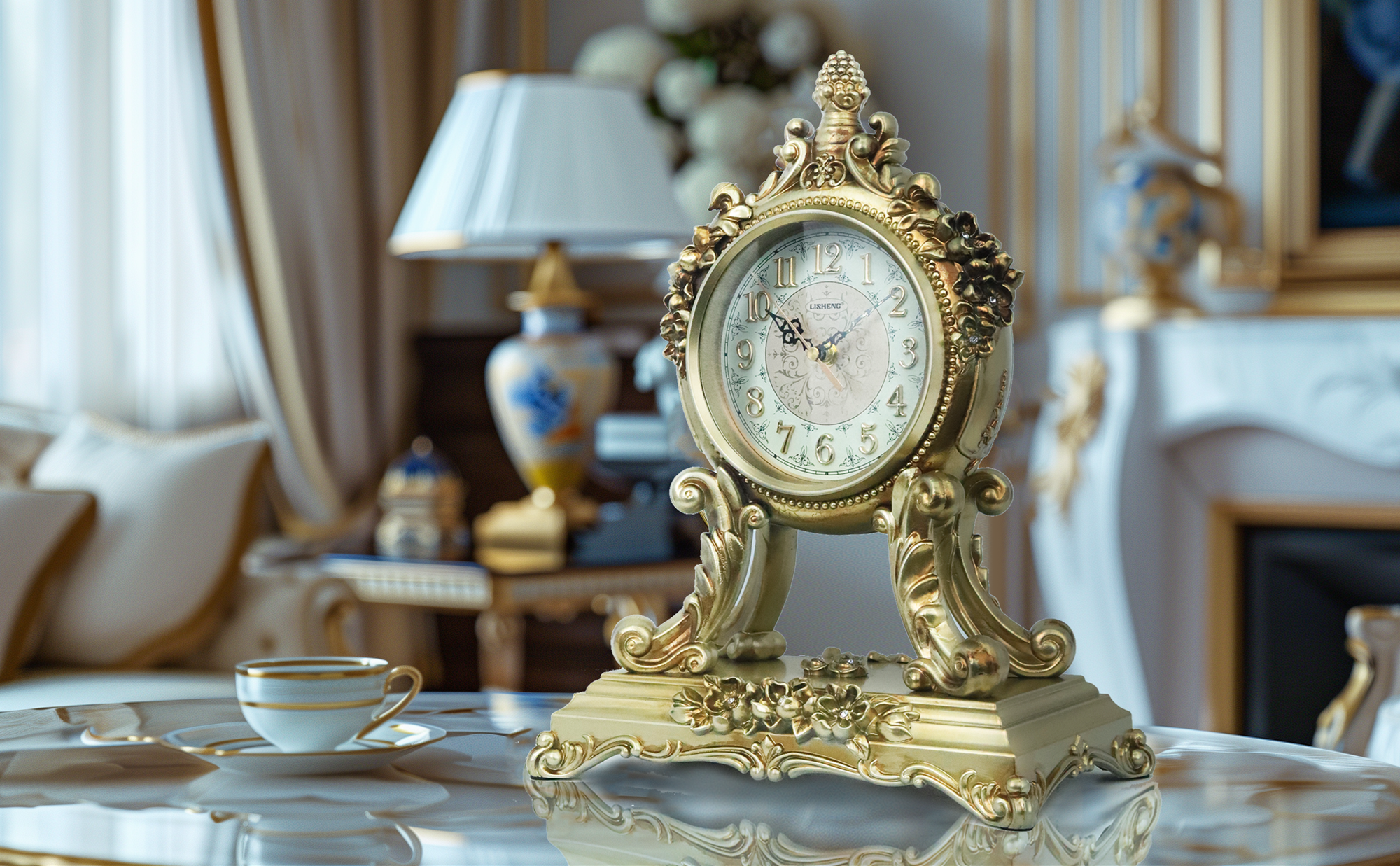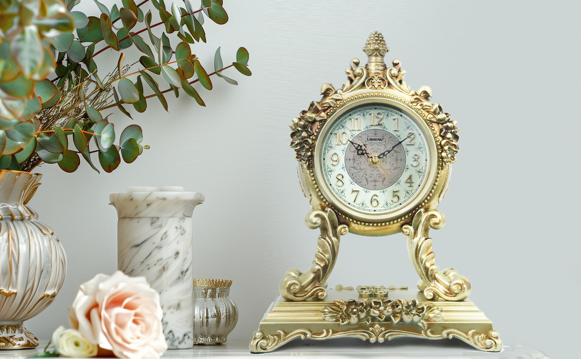 وجه الساعة المزخرف: يعرض وجه الساعة الدائري أرقامًا ذهبية وعقارب سوداء مزخرفة وخلفية زهرية مفصلة، مما يوفر كلاً من الوظيفة واللمسة الفنية.