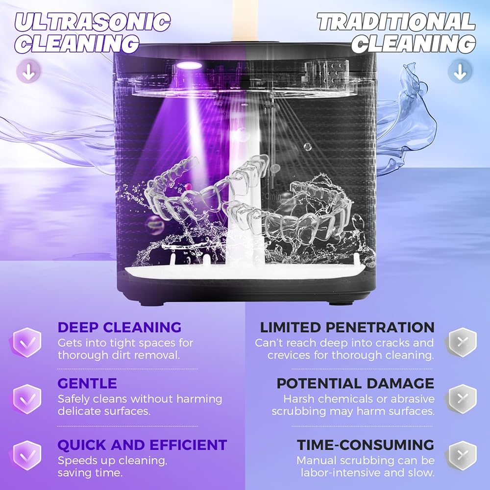 【تقنية التنظيف بالموجات فوق الصوتية المتقدمة】 استمتع بكفاءة تنظيف لا مثيل لها باستخدام تقنية الموجات فوق الصوتية، التي تولد موجات صوتية عالية التردد لإنشاء فقاعات تجويف مجهرية. تتغلغل هذه الفقاعات بعمق في كل زاوية وركن، وتزيل الأوساخ والأوساخ والبكتيريا بشكل فعال حتى من العناصر الأكثر تعقيدًا.