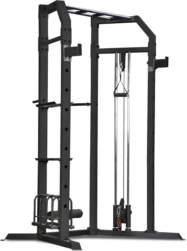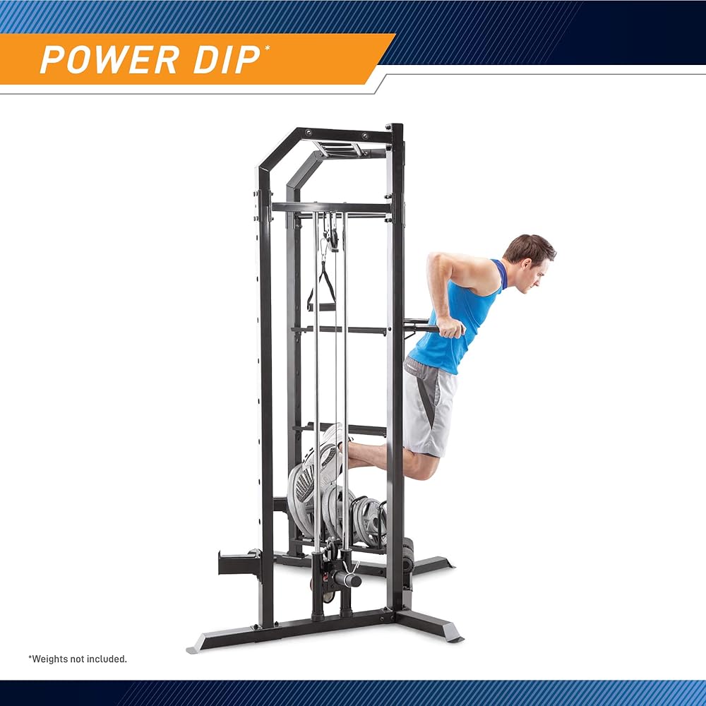 This Marcy cage is equipped with dual-function press arms that are ideal for performing upper-body exercises. The lateral bar, furthermore, is perfect for pulldown exercises, which develop both the chest and the back while building shoulder strength. For dedicated bicep workouts using dumbbells or weights, the free-weight rack allows you to store an optional Olympic bar so you can easily perform strength training without having to switch to a different workout station.