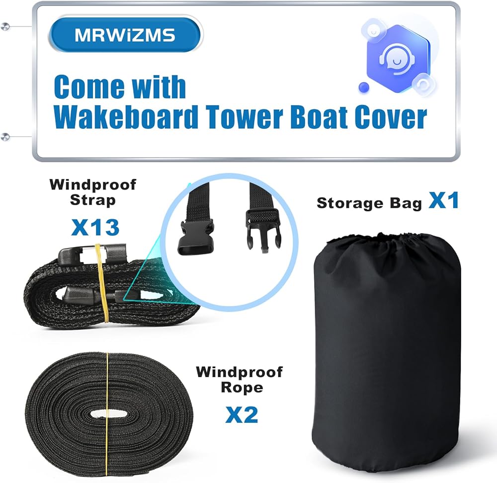 🚤Customer Service: 7x24 online customer support for our heavy duty wake tower boat cover. Ask us anything at any time. We will be happy to assist you and serve to your satisfaction. Have fun with MRWiZMS waketower boat cover.