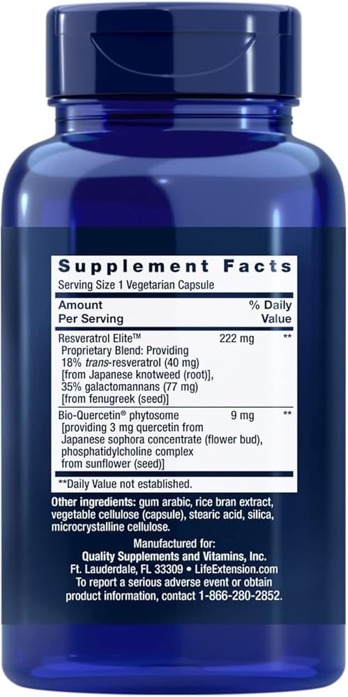 Resveratrol Elite Proprietary Blend: Providing 18% trans-resveratrol (40 mg) [from Japanese knotweed (root)], 35% galactomannans (77 mg) [from fenugreek (seed)], Bio-Quercetin phytosome [providing 3 mg quercetin from Japanese sophora concentrate (flower bud), phosphatidylcholine complex from sunflower (seed)]. Other ingredients: gum arabic, rice bran extract, vegetable cellulose (capsule), stearic acid, silica, microcrystalline cellulose.