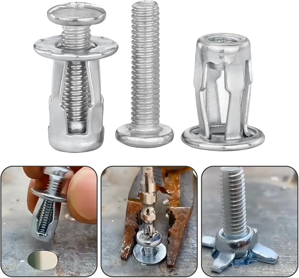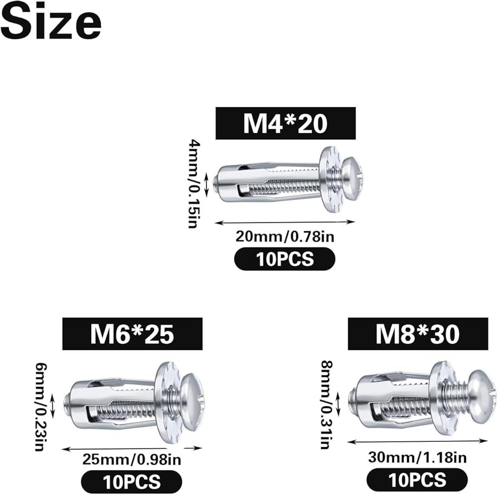 30PCS in total, three sizes, 10 pieces each: M4 x 20mm, M6 x 25mm and M8 x 30mm,suitable for shallow hollow panels like doors and caravan walls.