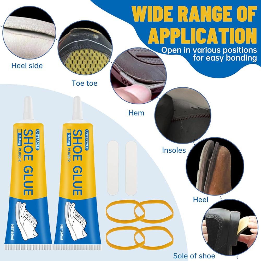 Package Includings:60 ml*2 Shoe glue, 4 rubber bands, 2 sandpapers