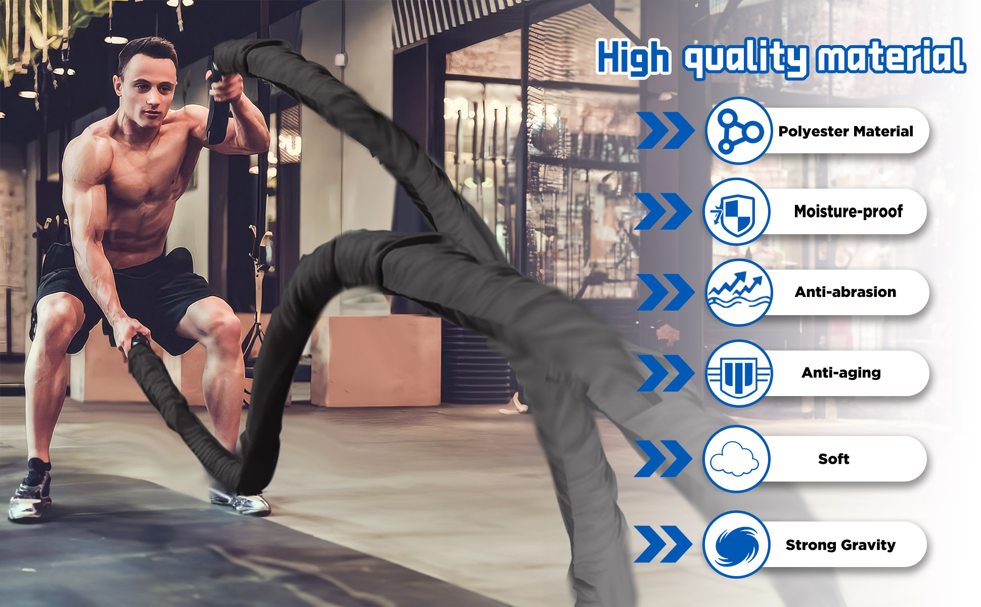 【حبل التمرين سهل الاستخدام والتخزين】سواء كنت في المنزل أو في صالة الألعاب الرياضية أو في الهواء الطلق، فإن حبل التمرين هذا سهل الإعداد والاستخدام. ما عليك سوى تثبيتها على جسم قوي وستكون جاهزًا لبدء جلسة التدريب الخاصة بك. يمكن استخدام حبال المعركة لصالة الألعاب الرياضية المنزلية في الصعود والهبوط، أو السحب أو التسلق، وتمارين الحبال الرياضية، وحبل التدريب، وحبل اللياقة البدنية، وحبل المعركة، وما إلى ذلك. يمكن طيها بسهولة للتخزين عند عدم الاستخدام. كما أن التصميم المرن يوفر سهولة الحمل
