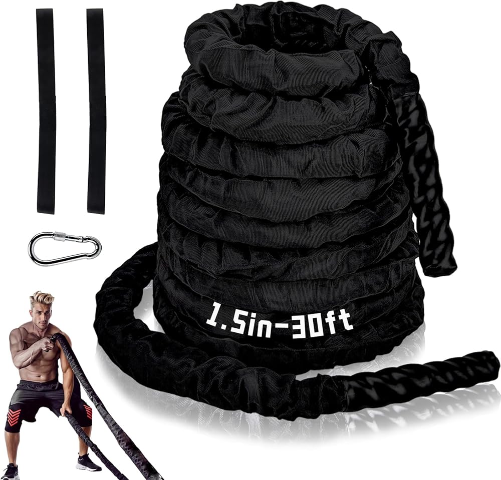 حبال تمرين المعركة مقاس 1.5 بوصة 30 قدمًا - حبال تمرين من البوليستر شديدة التحمل لصالة الألعاب الرياضية المنزلية وتدريبات القوة ومعدات اللياقة البدنية - أسود