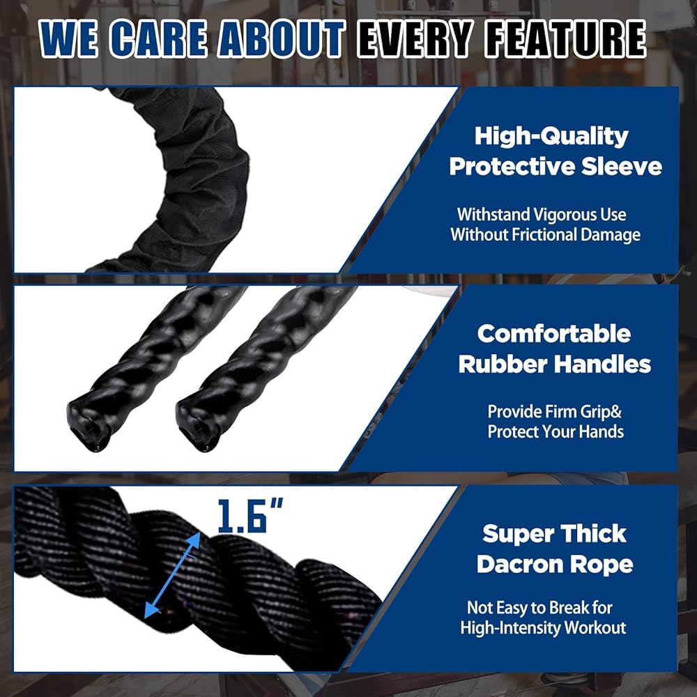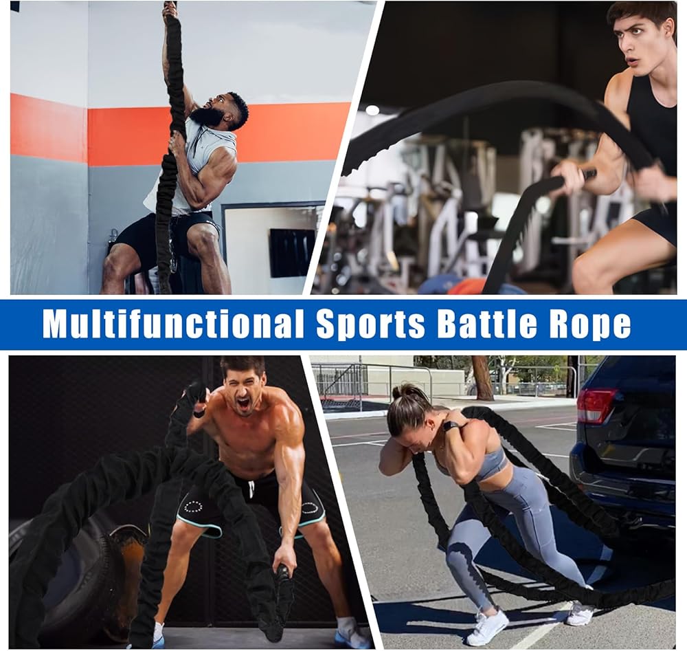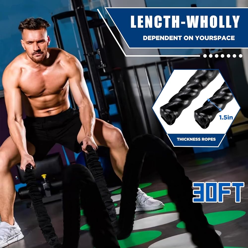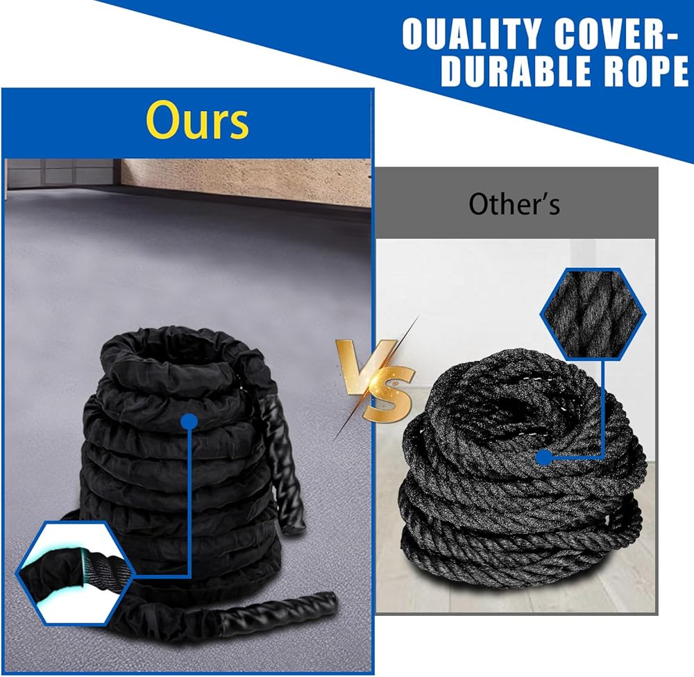 【هيكل متين】حبال المعركة مصنوعة من البوليستر عالي الجودة، ومصممة لتحمل التدريبات المكثفة وتوفير متانة طويلة الأمد لجميع احتياجات اللياقة البدنية الخاصة بك. قطر 1.5 بوصة، طول 30 قدمًا، حبل معركة ملتوي عالي التحمل مكون من 3 خيوط