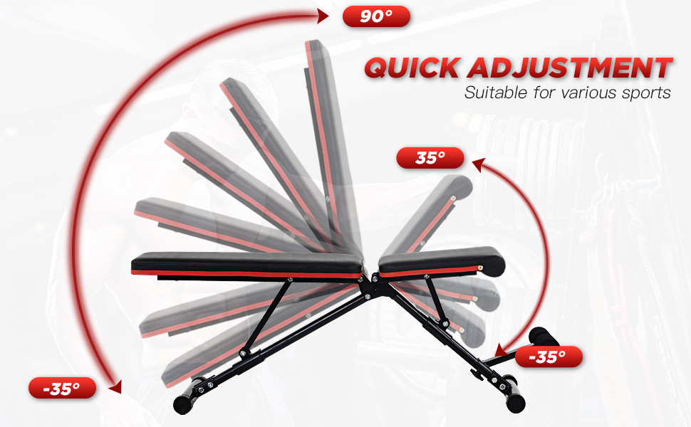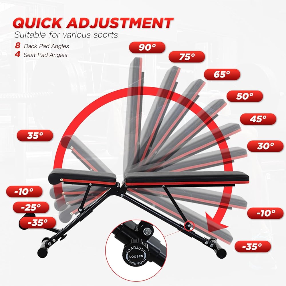 【قفل تلقائي سريع وقابل للتعديل】: مصمم بـ 9 زوايا للوسادة الخلفية، و4 زوايا لوسادة المقعد، وموضعين للساقين لتدريبات الجسم بالكامل. يمكنك بسهولة سحب القفل الزنبركي ذاتي المرونة لضبط الميل بسرعة من 90 درجة إلى 35 درجة، بما يلبي احتياجاتك. توفر أسطوانة القفل عالية الجودة إمكانية القفل الآمن.