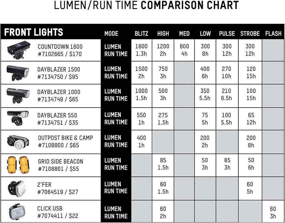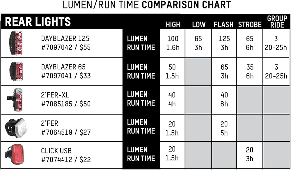 • وضع الركوب الجماعي - تتميز مصابيح Dayblazer الخلفية بميزة الركوب الجماعي التي تسمح لها بالعمل بسرعة 3 لومن بحيث يمكن رؤيتك دون تعمية شركائك في الركوب.