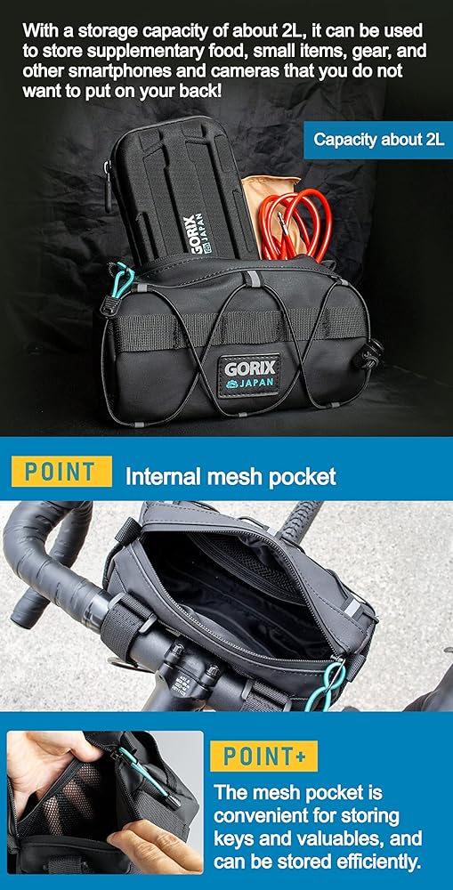 [يمنع دخول الماء. ] [سعة 2 لتر] مع سعة تخزين تبلغ حوالي 2 لتر، من الممكن تخزين الأشياء الصغيرة والهواتف الذكية والمفاتيح والكاميرات وما إلى ذلك. بالطبع، يمكن تخزين أساسيات الدورة مثل الأنابيب بشكل آمن. أيضًا كحقيبة فرعية بخلاف أكياس السرج.