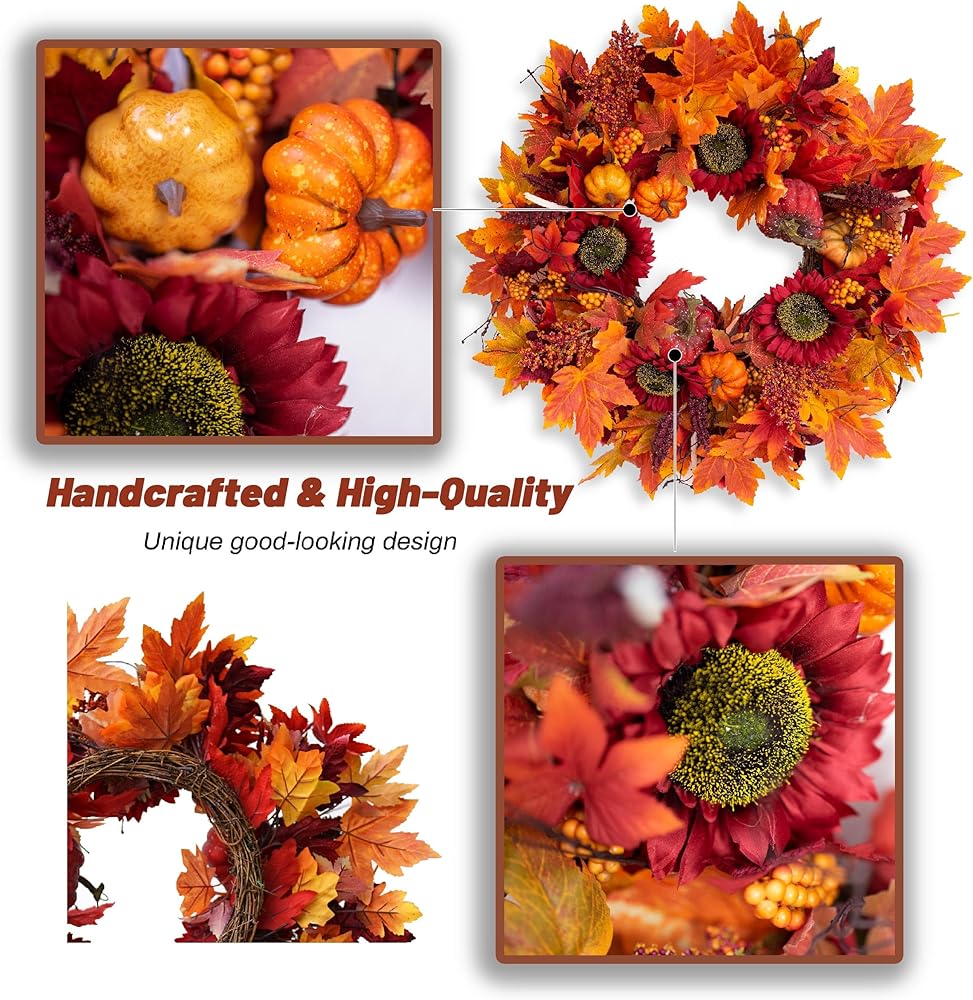 【طبيعية عالية الجودة】نحن ملتزمون بصناعة أكاليل الخريف الطبيعية عالية الجودة. باستخدام حلقة الكرمة كقاعدة، قمنا بترتيب أوراق الخريف المتدرجة وعباد الشمس والقرع الصغير الرائع بمهارة، مما يضمن تثبيت كل عنصر بشكل آمن. الزهور مصنوعة من نسيج الحرير بدلاً من البلاستيك أو الرغوة، مما يلتقط بشكل مثالي ألوان الخريف النابضة بالحياة من أجل جمال يدوم طويلاً.