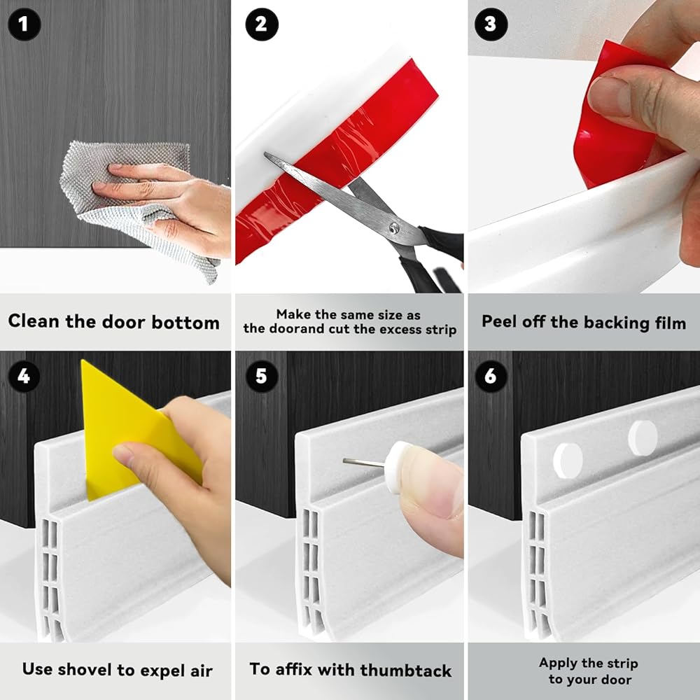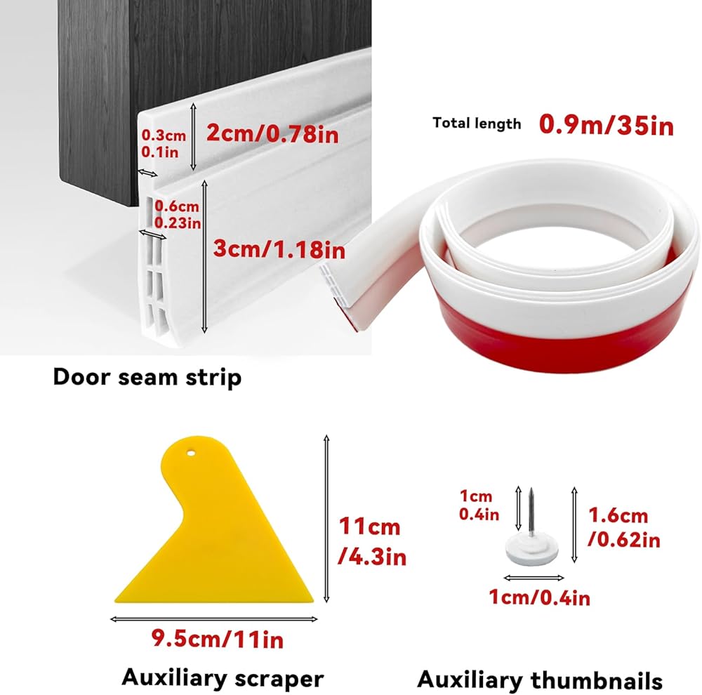 【شريط ختم أسفل الباب مع مكشطة ومثبتات الإبهام - أداء أفضل】سدادة باب من السيليكون تتضمن عبوتين من شريط ختم السيليكون الأبيض (34.4 بوصة طول × 2 بوصة عرض)، قطعة واحدة مكشطة و10 قطع مسامير إبهام. يمكن استخدام المكشطة للمساعدة في لصق شقوق الأبواب و طرد الفقاعات التي تظهر عند اللصق. يتم استخدام مسامير التثبيت لتعزيز طبقات الأبواب. باستخدام الأدوات المساعدة، يمكنك التثبيت بسهولة أكبر والحصول على تأثير أكثر قوة.