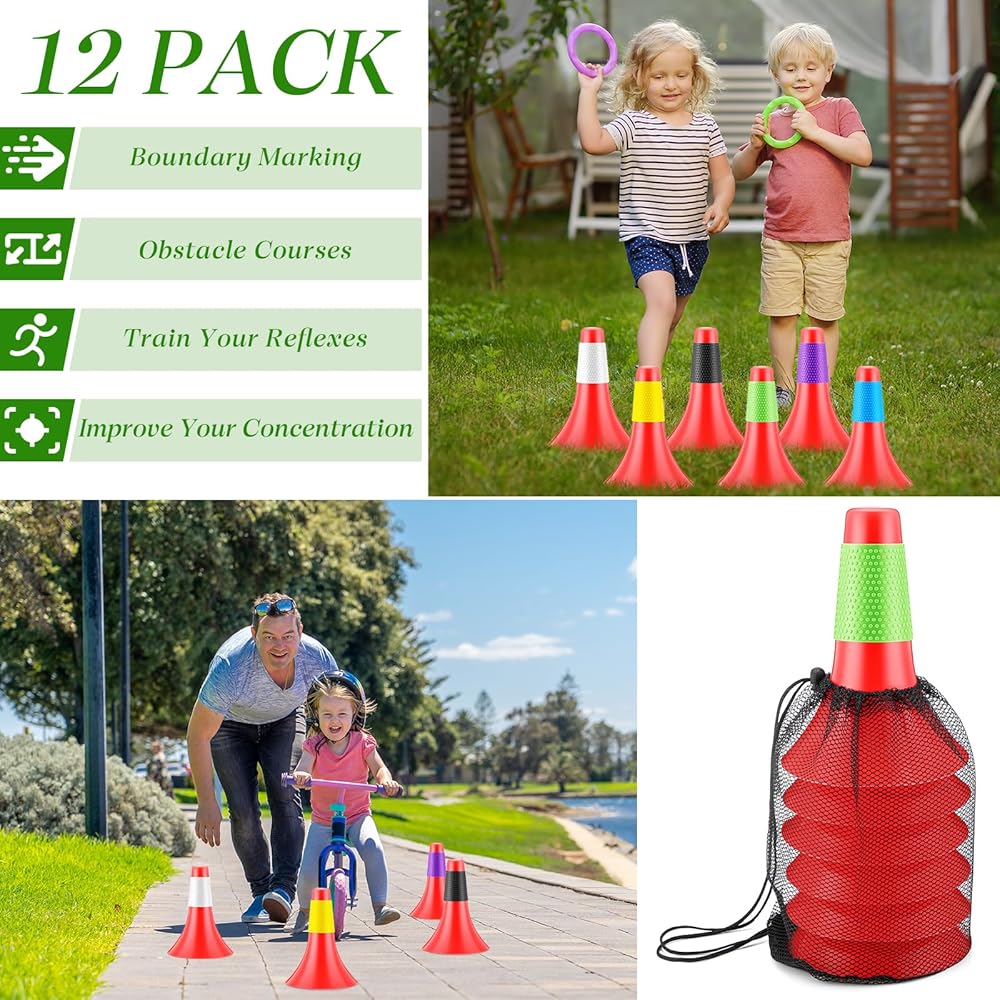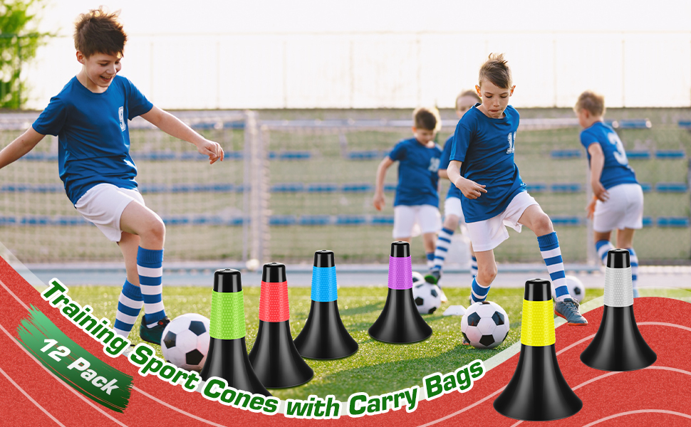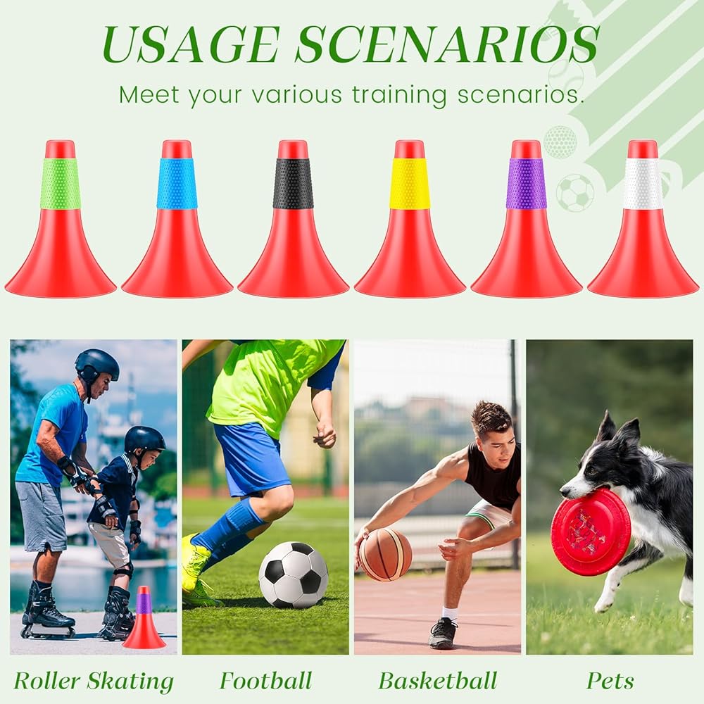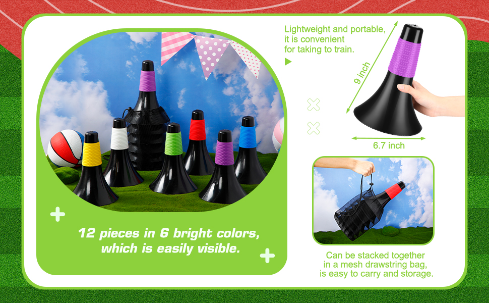 • ما تحصل عليه: سوف تحصل على 12 قطعة من المخاريط الرياضية للتدريب على الرشاقة مع حقيبتين للحمل، وتتميز بـ 6 ألوان (أسود، أصفر، أزرق، أخضر، أبيض، أرجواني)، قطعتين لكل لون، كمية كافية وألوان زاهية ستلبي احتياجاتك من السرعة ومهارات المراوغة والتدريب على خفة الحركة