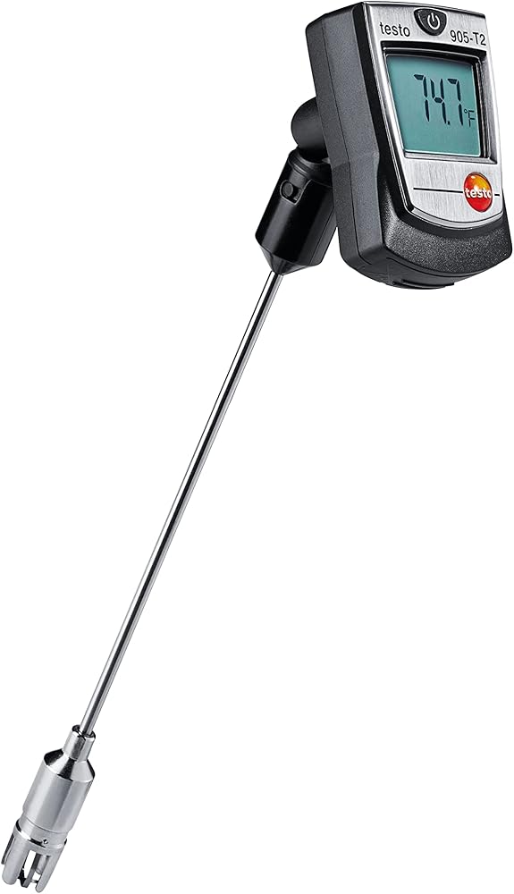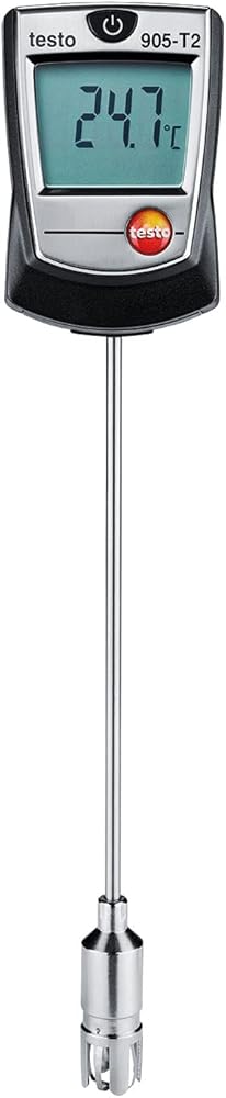 Testo 905-T2 Temperature Gun Achieve reliable and accurate measurements of temperature in pipes, plumbing, refrigeration systems, and even kitchen appliances like an oven or hot plate thanks to the testo 905-T2 heat temperature gun. Technical Details: Measuring range: -58° to 662 °F (short-term to 932 °F) / -50 to +350 °C (short-term +500 °C) Accuracy: +-(2 °F +-1 % of mv) / +-(1 °C +-1 % of mv) Resolution: 0.1 °F / 0.1 °C Reaction time: t99 = 5 sec Weight: 3 oz. / 80 g Dimensions: 8.7 x 1.6 x 2.8 in. ((LxWxH)) / 220 x 40 x 70 mm ((LxWxH)) Operating temperature: 32° to 104 °F / 0 to +40 °C Housing: ABS Product color: Black Authorizations: CE 2004/108/EWG Length probe shaft: 5.906 in. / 150 mm Length probe shaft tip: 1.575 in. / 40 mm Diameter probe shaft: 0.118 in. / 3 mm Diameter probe shaft tip: 0.472 in. / 12 mm Battery type: 3 x AAA Battery life: 1000 h Display type: LCD Display size: one-line Storage temperature: -4° to 158 °F / -20 to +70 °C Scope of Delivery: testo 905-T2 surface thermometer with large measuring range, including attachment clip and batteries