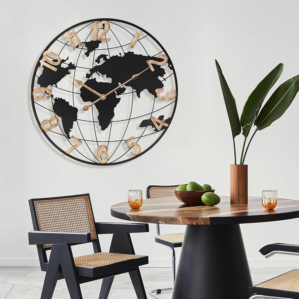 • 【ديكور مثالي للحائط】ساعة الحائط المعدنية الحديثة الكبيرة لبيت المزرعة تجذب الانتباه بالتأكيد على الحائط وتبرز؛ إذا كنت ترغب في الحصول على ساعة حائط أكثر تزيينًا للديكور الجديد؛ إنها إضافة رائعة لمدفأة غرفة المعيشة الخاصة بك، والمطبخ، غرفة الطعام، غرفة النوم، فوق التلفزيون أو في أي مكان؛ يتوقف الناس لمشاهدة ساعة الحائط بخريطة العالم والتعليق على حداثة الساعات.