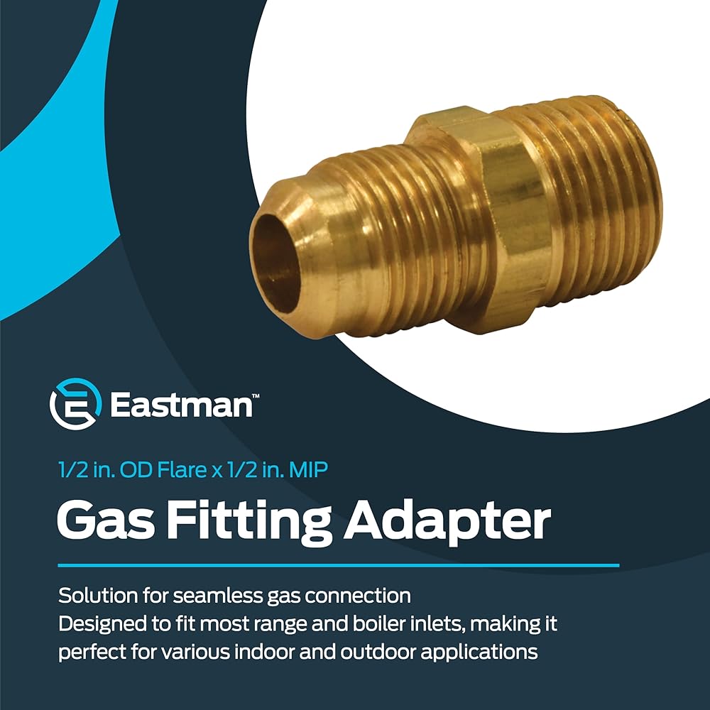 Introducing the Eastman Gas Fitting Adapter, the ultimate solution for seamless gas connections. Engineered for versatility, this adapter is designed to fit most water heaters and dryer inlets, making it perfect for various indoor and outdoor applications, from gas logs to moderate-usage appliances. Crafted from durable zinc-plated steel, this adapter ensures long-lasting protection against rust, stains, and UV exposure. The precision fittings, including a 1/2 inch OD flare and a 1/2 inch male gas fitting adapter, guarantee a secure connection to gas appliances, providing peace of mind and reliability. Upgrade your gas experience with Eastman's easy-to-install adapter—no special tools required. Connect gas log kits to a shut-off valve effortlessly by cleaning pipe threads, applying sealant, and threading steel fittings. Turn on the valve, perform a leak-free test with gas leak solution, and enjoy worry-free gas connections. Whether you're in need of propane fittings, brass flare unions, or natural gas quick-connect fittings, this gas connection fitting adapter has you covered!