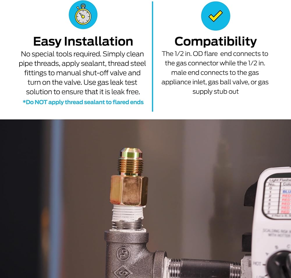 • EASY TO INSTALL: No special tools required to quickly connect gas log kits to a shut-off valve. Simply clean pipe threads, apply sealant, thread steel fittings to manual shut-off valve and turn on the valve. Use gas leak test solution to ensure that it is leak free. Do NOT apply thread sealant to flared ends