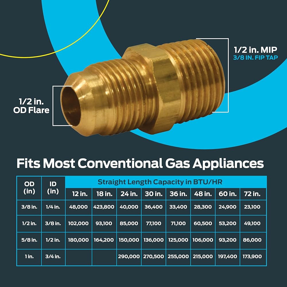 • COMPATIBILITY: The 1/2 inch OD flare dryer vent fitting adapter connects to the gas connector nut while the 1/2 inch male gas fitting adapter connects to the gas appliance inlet, gas ball valve, or gas supply stub out
