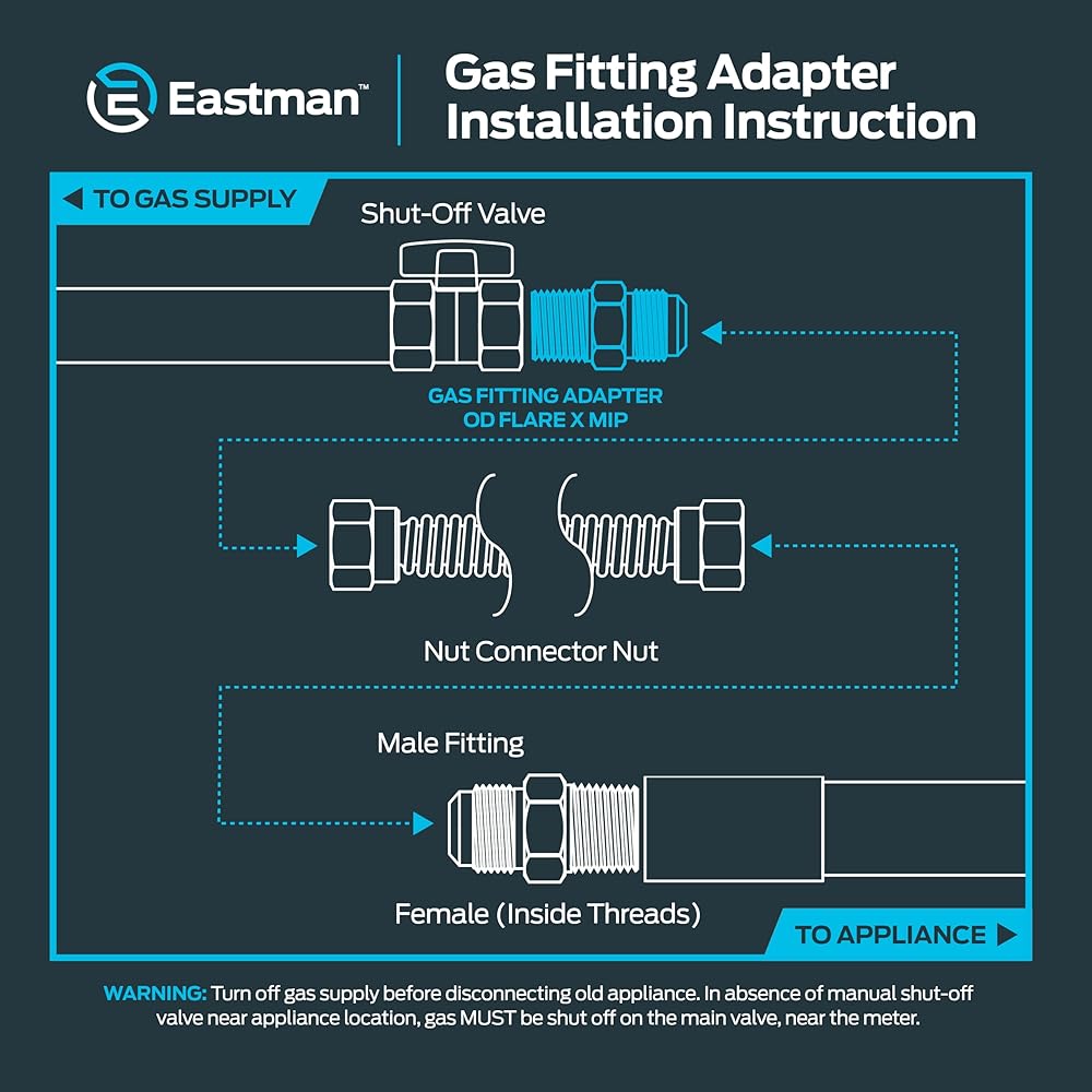 • EASTMAN GAS FITTING ADAPTER: Designed for most water heaters and dryer inlets, this gas fitting adapter offers a versatile solution for various indoor and outdoor applications, including gas logs, grilles, fireplaces, space heaters, dryer vents, and moderate-usage appliances