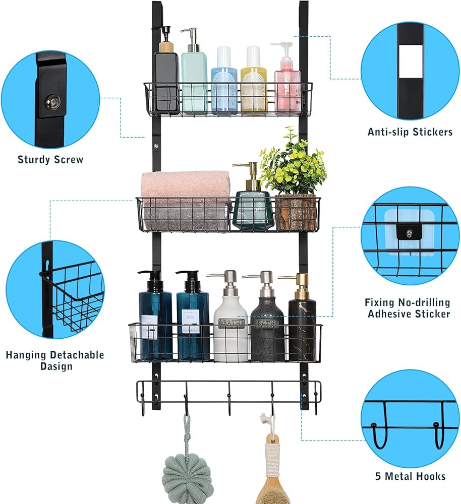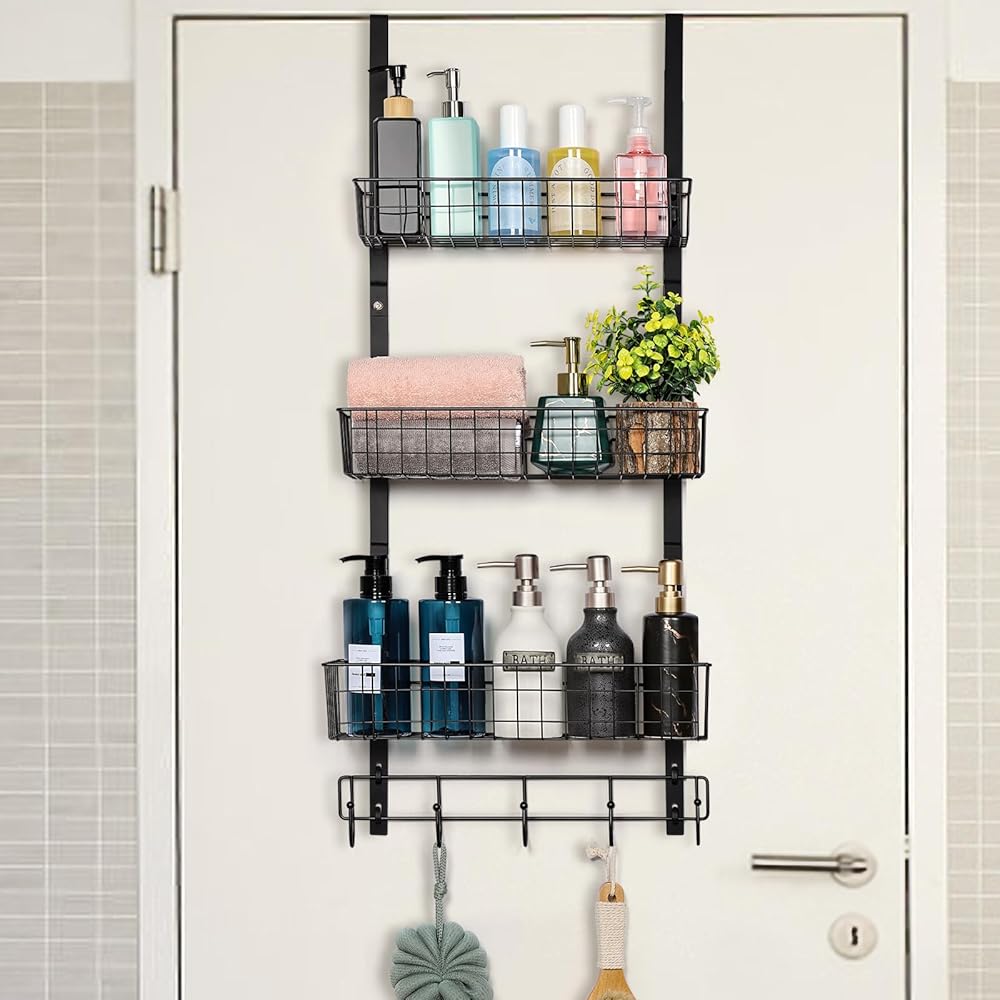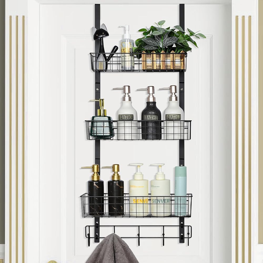 منظم شماعات خطاطيف على الباب من NEX، رف منشفة بخطاطيف معطف مع 3 سلة شبكية و5 خطافات معلقة للتخزين رف توابل للحمام وغرفة النوم والمطبخ خلف أرفف تخزين الباب، أسود