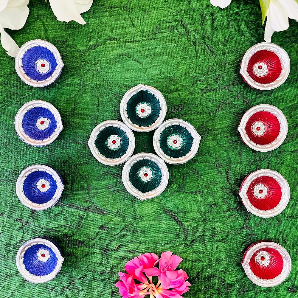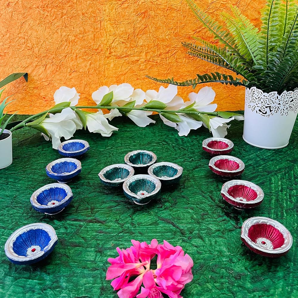 مجموعة من 12 دياس ديا ديباك تراثي مجموعة ملونة متنوعة - ديكور ديوالي بوجا - ديا مرسومة يدويًا للمنزل الداخلي والخارجي، تصميم ديوالي مصنوع يدويًا مع فتيل قطني