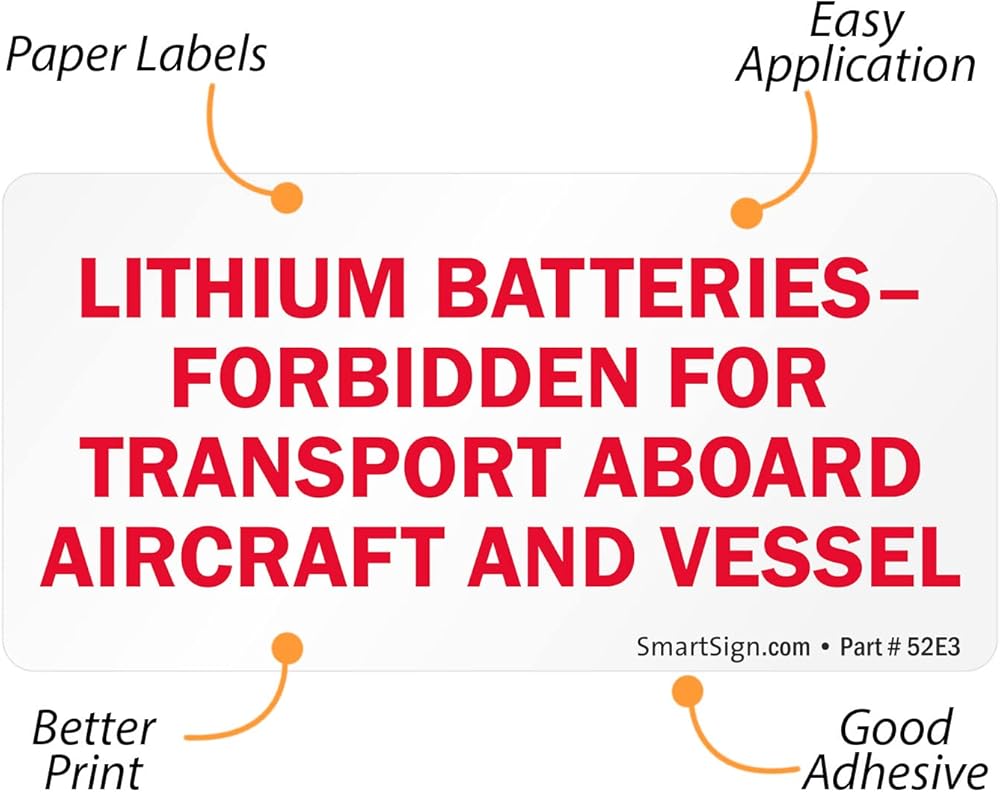 حزمة SmartSign مكونة من 250 بطاقة شحن "بطاريات الليثيوم المحظورة للنقل على متن الطائرات والسفن" في لفة | 2 × 4. ورق شبه لامع، صنع في الولايات المتحدة الأمريكية