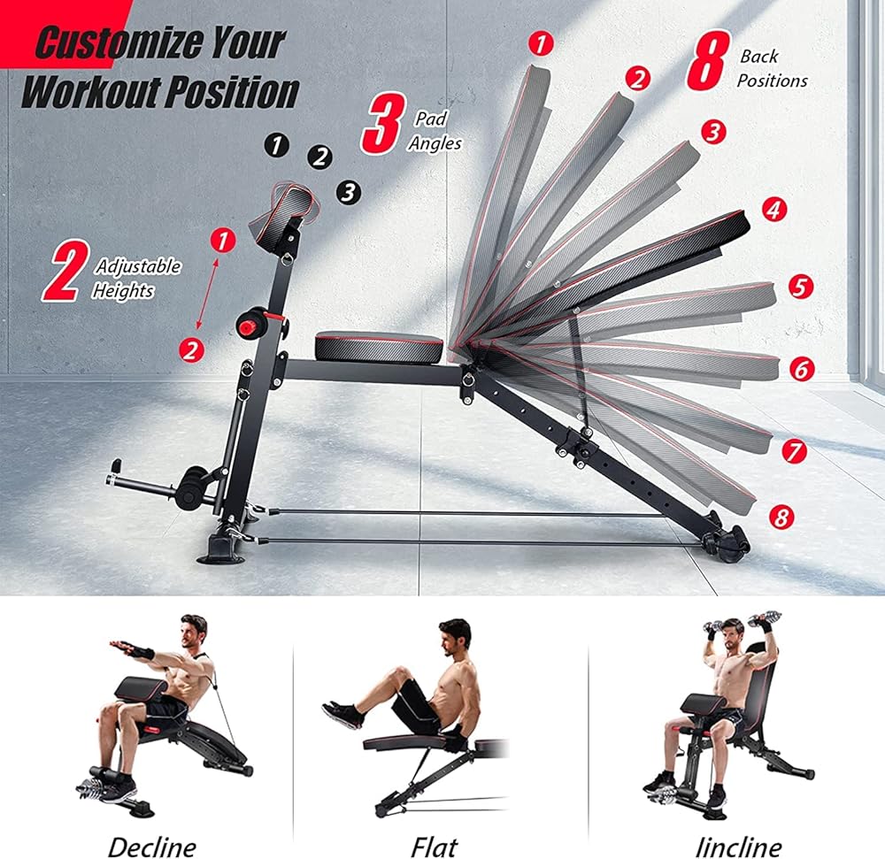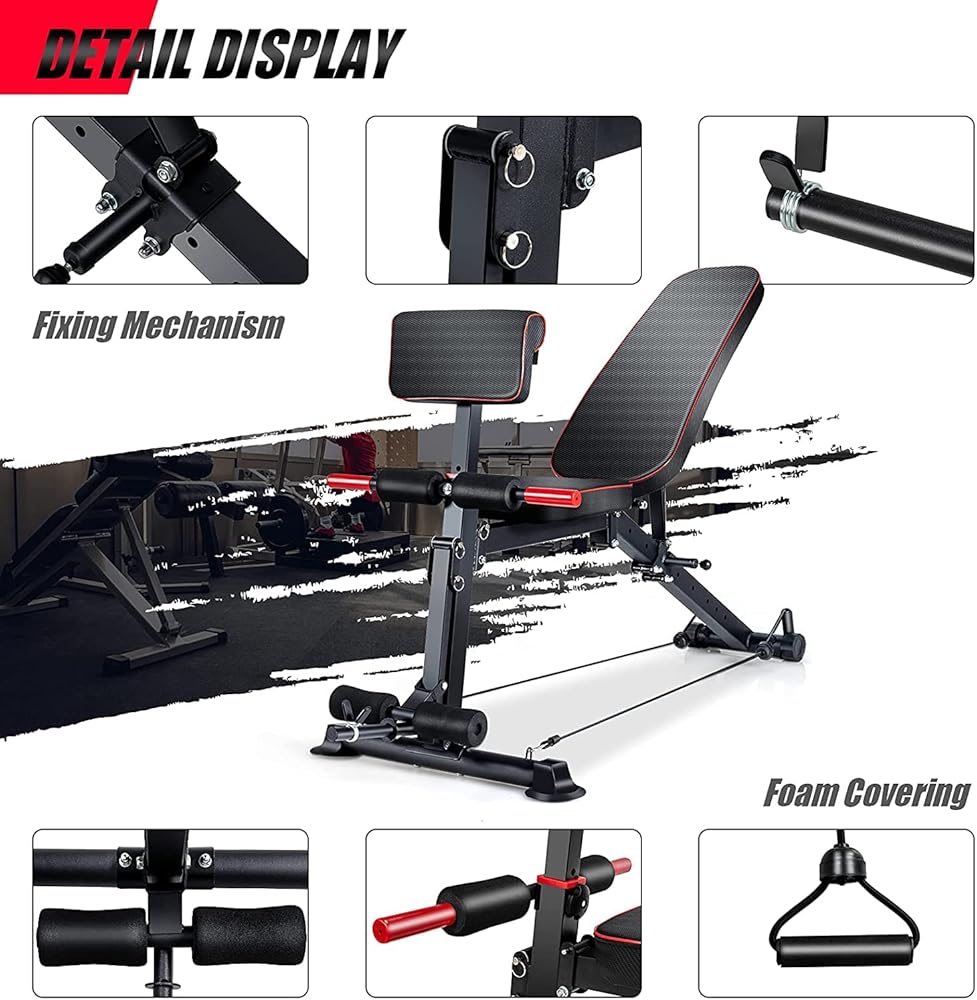 • 💪【ADJUSTMENT & FUNCTION】: Workout bench has 10 backrest pad positions and 3 preacher pad degrees to meet your home gym demand. Adjustable weight bench is ideal for full-size adult working out and training on your chest,shoulder,back,abs,leg and more.