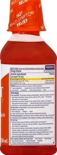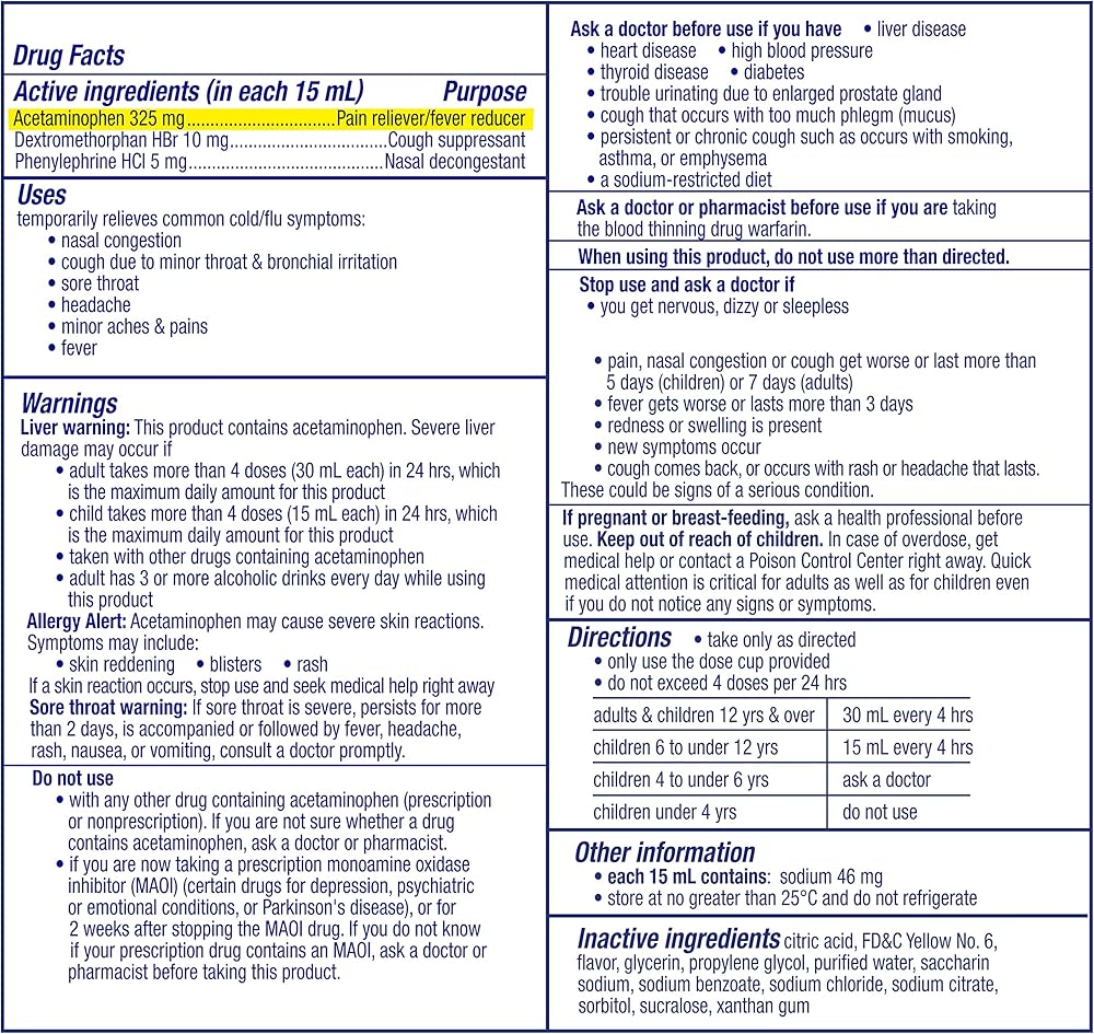The Non-Drowsy, Coughing, Aching, Fever, Sore Throat, Stuffy Head, NO SICK DAYS, Medicine brought to you by VICKS, the world's #1 selling cough and cold brand. The non-drowsy, multi-symptom cold and flu relief of DayQuil Cold & Flu Liquid helps you get your power back, so you can enjoy the day. Each dose contains acetaminophen, a pain reliever/fever reducer than can help soothe your sore throat. Adults and children 12 years and over, take 30 mL every 4 hours. Children 6 to under 12 years, take 15 mL every 4 hours. Do not exceed 4 doses per 24 hours. Take only as directed. Only use the dose cup provided.