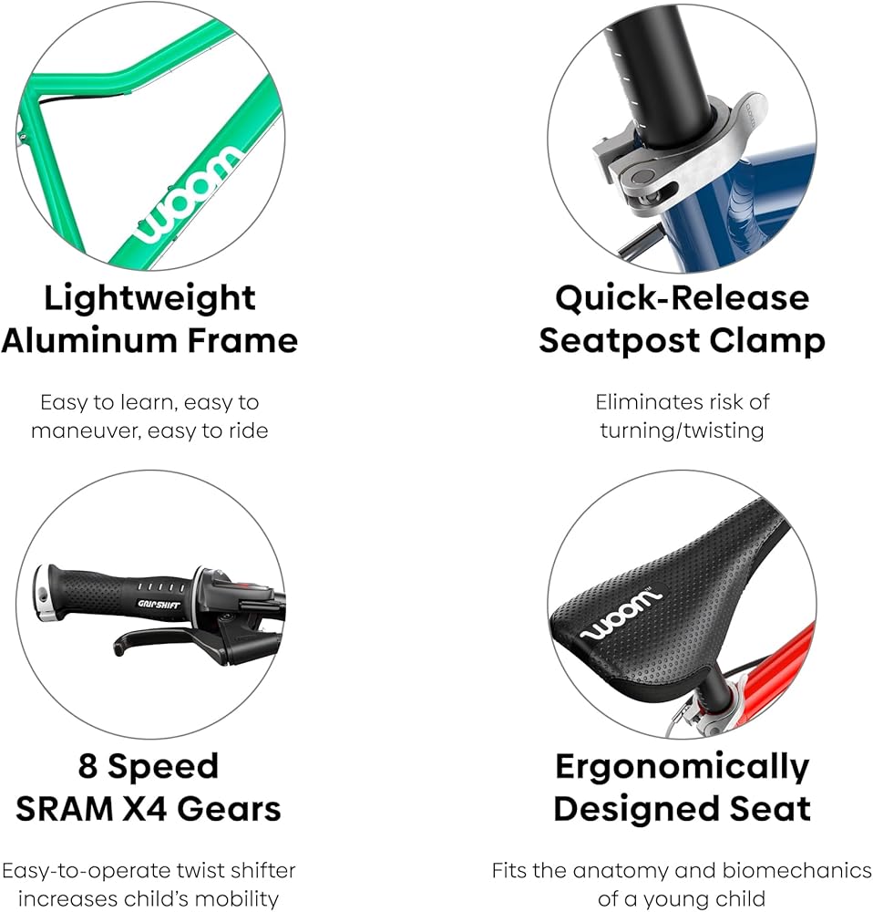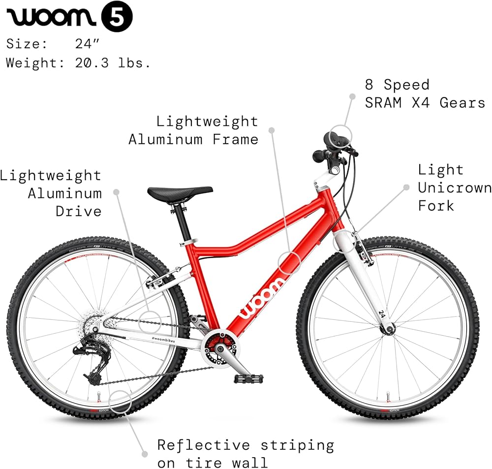 دراجة ذات ثماني سرعات: إن Wooom 5 عبارة عن دراجة أطفال خفيفة للغاية مقاس 24 بوصة تقدم الأطفال من سن 7 إلى 11 عامًا إلى عالم نقل التروس. إن السرعات الثماني لدراجة woom 5 جنبًا إلى جنب مع ناقل الحركة الملتوي تجعل من التغلب على تلك التلة الكبيرة في الحي أمرًا سهلاً. (مواصفات wom 5: الإطار: 24 بوصة، ارتفاع السرج القابل للتعديل 27.2 بوصة - 33.1 بوصة، وزن الدراجة (بدون الدواسات): 20.3 رطلاً، الحد الأقصى للوزن: 175 رطلاً.)