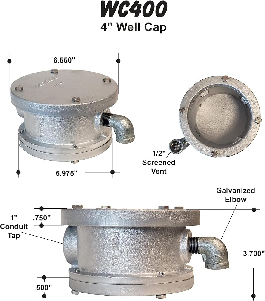 غطاء بئر صحي مانع للماء من Merrill MFG، غلاف 4 بوصة، صنبور قناة 1 بوصة، فتحة تهوية 1/2 بوصة