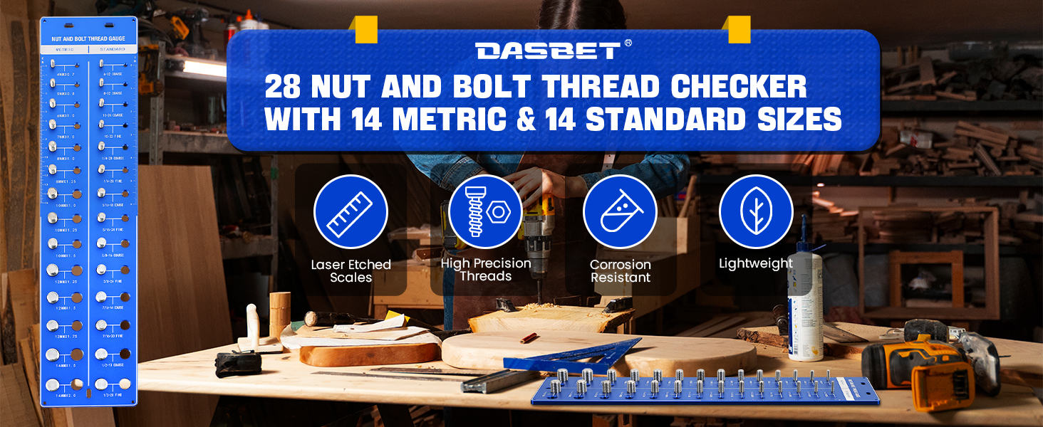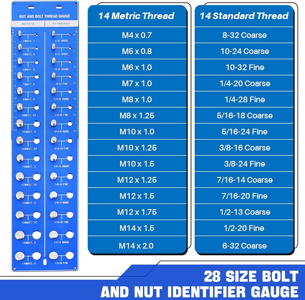 مدقق خيط صامولة ومسمار DASBET 28 مدقق خيط، حجم الخيط مدقق حجم الترباس ومقياس الخيط مع 14 معيار و 14 مقياس متري ومعرف الجوز مع مسطرة بوصة وسنتيمتر، أزرق