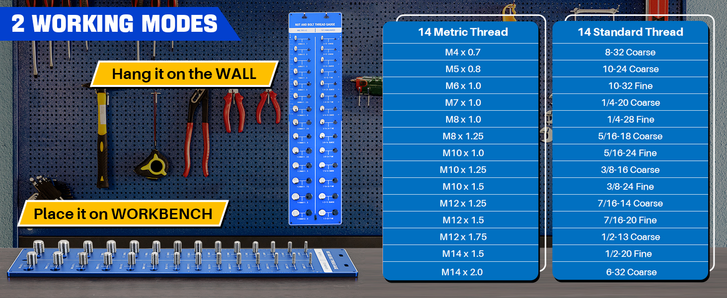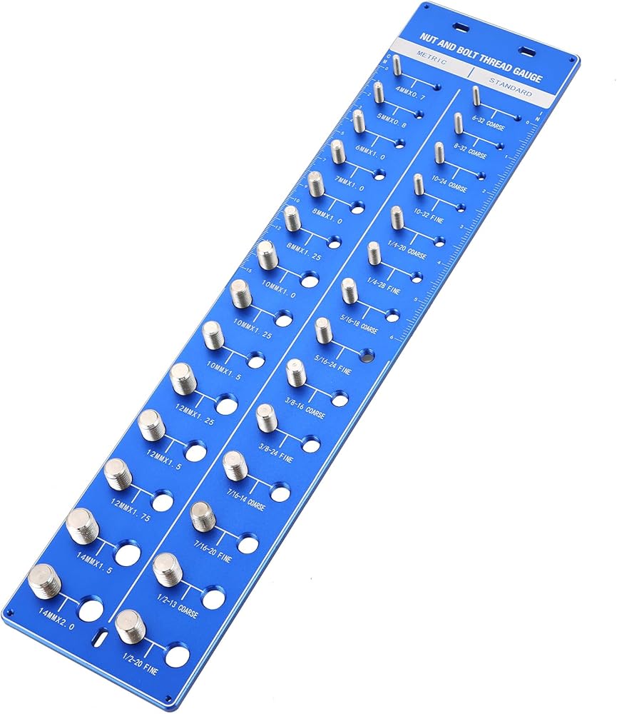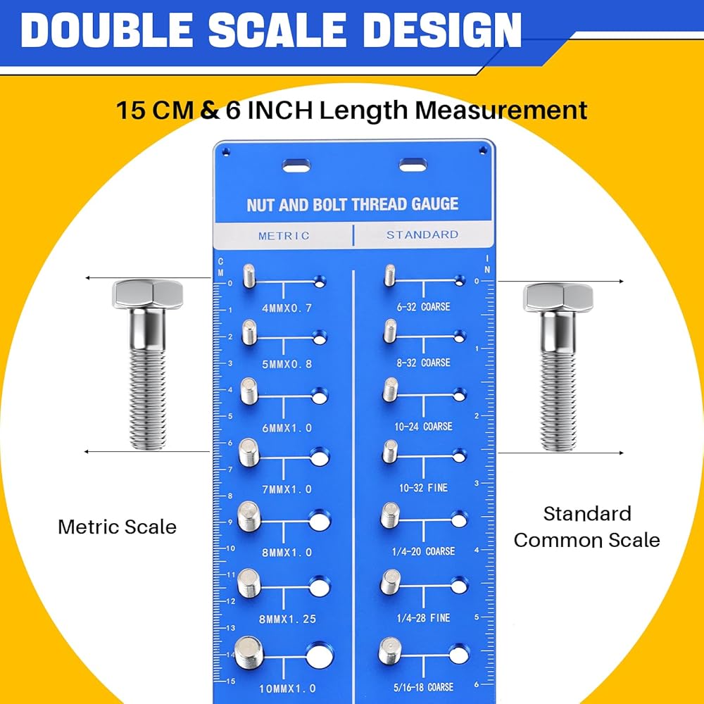 • فحص الأبعاد الشامل: يحتوي حجم الترباس ومقياس الخيط على 14 مقاسًا متريًا و14 مقاسًا قياسيًا مع مسطرة بالبوصة والسنتيمتر. يمكنه التعرف على ما يصل إلى 28 مقاسًا مختلفًا من البراغي والصواميل، بما في ذلك أحجام الخيوط المترية من M4 x 0.7 إلى M14 x 2.0، والخيوط القياسية من #6 - 32 FINE إلى 1/2 - 20 FINE. لا يستغرق الأمر سوى بضع ثوانٍ للتمييز بسرعة ودقة بين البراغي والمسامير والصواميل ذات الأحجام المختلفة. لا غنى عنه مطلقًا إذا كنت تعمل باستخدام مثبتات مختلفة بشكل منتظم.