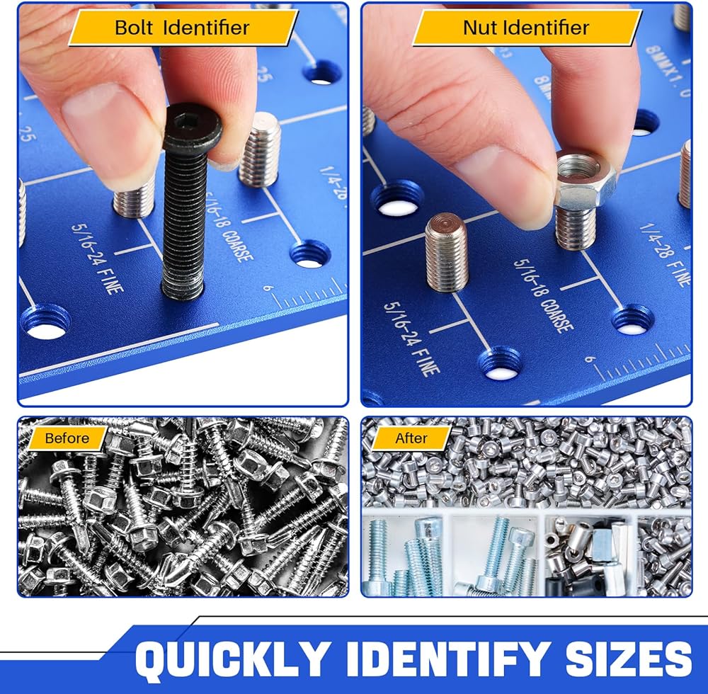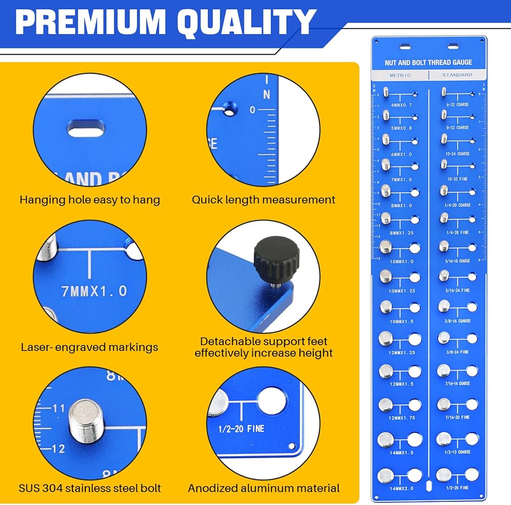 • علامات سهلة القراءة: يتميز حجم المسمار ومقياس الخيط الخاص بنا بمقاييس متينة محفورة بالليزر على الحافة، مما يوفر تحديدًا سريعًا ودقيقًا وسهلاً لأحجام الخيوط المختلفة، وقد تم تصميم لوحة تعريف المسمار بحروف بيضاء على خلفية زرقاء ، سهلة القراءة.