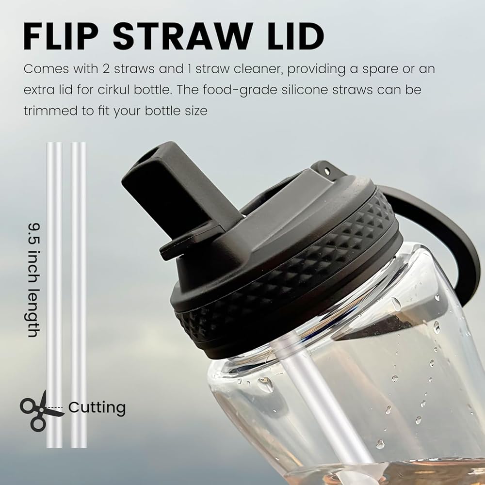 Value 2-Pack: Comes with 2 straws and 1 straw cleaner, providing a spare or an extra lid for cirkul bottle. The food-grade silicone straws can be trimmed to fit your bottle size. The wide finger loop makes it easy and comfortable to carry your bottle anywhere. Flip Straw Lid: Designed for one-handed drinking—just flip the straw top and sip. It's super easy to open and securely latches closed, making it idealfor both indoor and outdoor activities like sports, camping, and hiking. BPA-Free: Made from high-quality BPA-free materials, our straw cap is built to last. It won't retain odors that could affect the taste of your drink. Safe and easy to use for both adults and kids, this popular sport cap is an excellent lid for cirkul lid with straw. Leak-Proof: Swap out your cap for our lid and enjoy a leak-proof, dust-proof water bottle. It provides a reliable seal to keep your water fresh and clean. It's theperfect cap replacement option for upgrading your bottle and staying hydrated on the go. Compatibility: Our straw lid is fully compatible with cirkul lid replacement for 12 oz, 22 oz, 32 oz, 42 oz, and 62 oz plastic and stainless steel water bottles. The easy-sip mouthpiece makes it theperfect flip lid for cirkul cap replacement