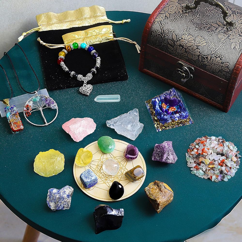 مجموعة كريستال طبيعية: تتكون هذه المجموعة الكريستالية من 7 أحجار شاكرا وأحجار متساقطة، وهرم عين النمر، وسوار عين النمر والبندول، ولوحة البندول، وقلادة السترين، وشجرة شاكرا الحياة، وحجر قلق إبهام عين النمر، وسيلينيت، و2 حبل قلادة مصنوع يدويًا، 1 صندوق هدايا عتيق و2 حقيبتين مخمليتين
