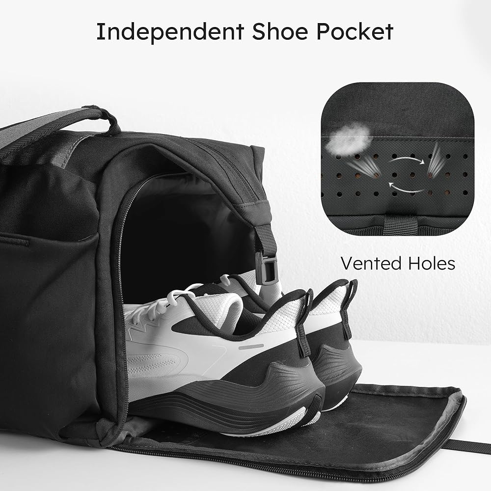 حجرة منفصلة للأحذية: تأتي حقيبة الظهر الخاصة بصالة الألعاب الرياضية مع حجرة أحذية مخصصة لإبقاء حذائك منفصلاً عن ملابسك النظيفة أو غيرها من العناصر. عند عدم الاستخدام، يمكن طي حجرة الأحذية وتثبيتها باستخدام الفيلكرو المرفق. توفر فتحات التهوية التهوية والتهوية للمساعدة في الحفاظ على الجزء الداخلي جافًا ومنتعشًا، مما يمنع انتشار أي رائحة أو أوساخ.