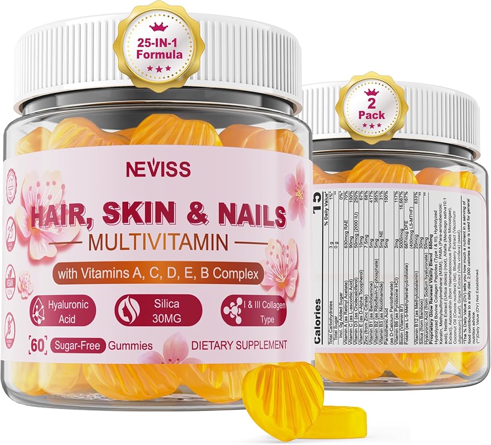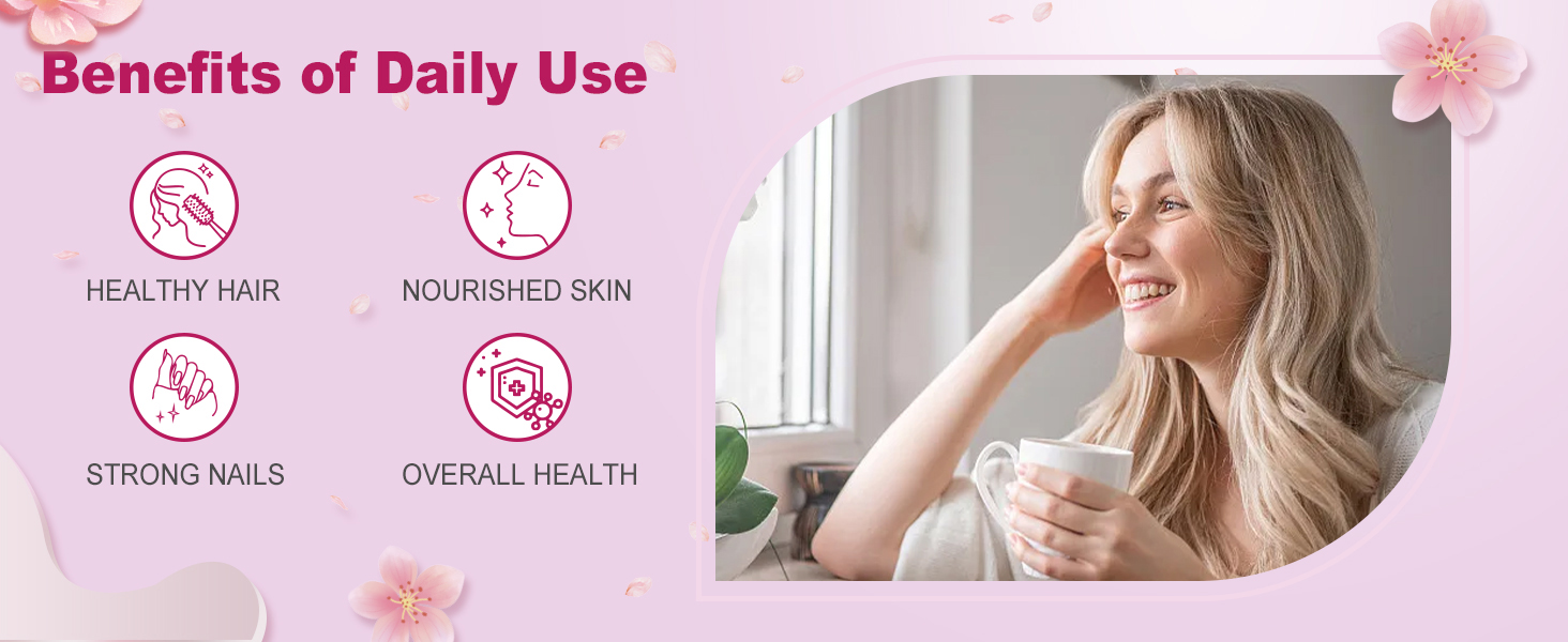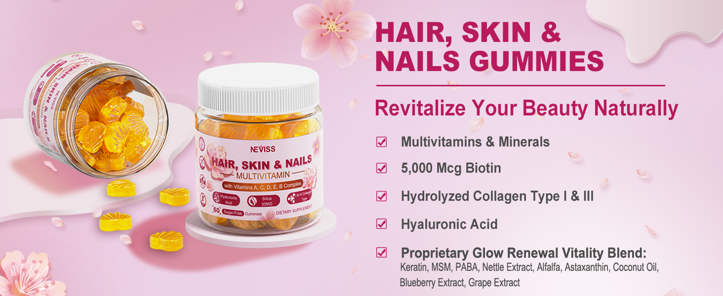 مليئة بالفيتامينات والمعادن المتعددة - العناية بشعرك وبشرتك وأظافرك تتجاوز المنتجات الخارجية؛ يتعلق الأمر بتغذية جسمك من الداخل. توفر تركيبتنا اليومية الخاصة العناصر الغذائية الأساسية لملء الفجوات التي يتركها نظامك الغذائي، مما يساعد على معالجة تساقط الشعر والأظافر الهشة والجلد الجاف.